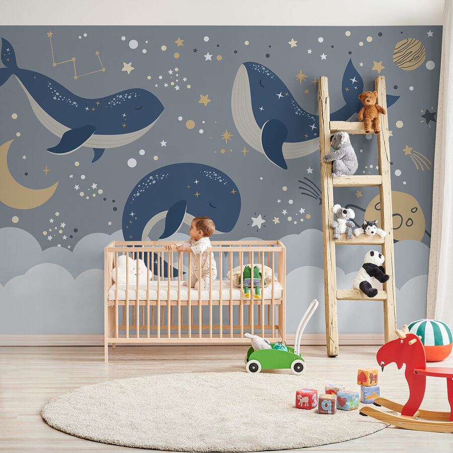 Chcete do dětského pokoje vnést zázrak? Podívejte se na tuto snovou “Nástěnnou malbu Modrá velryba s bílým ocasem a hvězdami!”. Představte si ji na stěně svého dítěte – je to jako jeho vlastní kousek noční oblohy, doplněný o plyšové modré velryby jemně proplouvající mořem hvězd a souhvězdí. Je ideální do dětských pokojů nebo do prostoru každého malého dobrodruha a dodává mu ten správný nádech kouzla a klidu. Navíc se zdá, že tyto ospalé velryby slibují sladké sny pro každého, kdo pod nimi usne. Je rozmarný, uklidňující a trochu hravý – nádherná kulisa pro pohádky před spaním a odpolední spánek. Ať už je to pro vašeho syna, dceru, nebo pro chvíle mazlení s vaším dítětem, promění každou stěnu v uklidňující hvězdné dobrodružství.