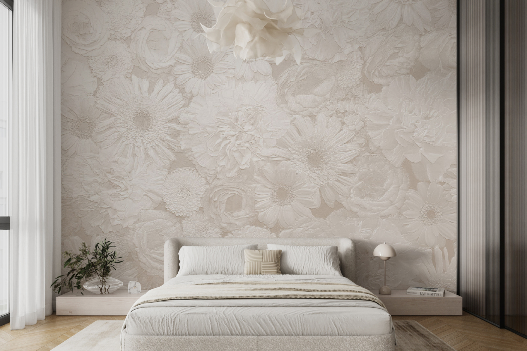 Chtěli jste někdy vnést na své stěny nádech elegance s nádechem? Tato nástěnná malba “Bílý květinový vzor” by mohla být tím pravým. Má jemnou, téměř šepotavou strukturu, která vás vtáhne dovnitř. Představte si, že se každé ráno probudíte do rozkvetlé zahrady přímo ve svém obývacím pokoji nebo ložnici. Jemné bílé tóny vytvářejí pocit útulného, klidného prostoru – ideálního pro odpočinek po dlouhém dni.