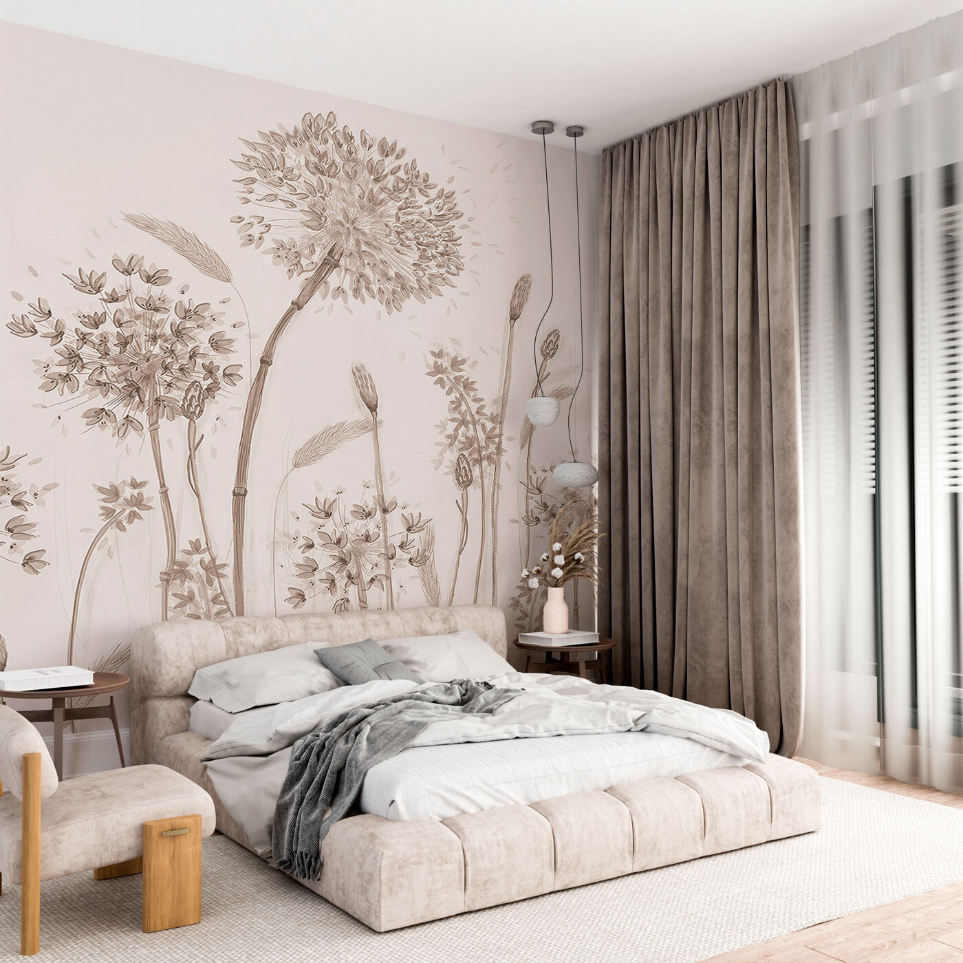 Podívejte se na tuto zasněnou nástěnnou malbu s jemnou kresbou rostliny. Má atmosféru pampelišek a divokých květin a dodá vašemu prostoru šepot přírody, aniž by byla příliš nápadná. Ideální pro někoho, kdo chce do interiéru vnést venkovní atmosféru bez brouků a špíny. Představte si, že se probouzíte s tímto jemně se pohupujícím pozadím – připadáte si jako na ranní procházce po louce, že? Nastříkejte trochu levandulové mlhy a jste prakticky tam. Je to ten typ tapety, díky které budou vaše stěny vypadat zajímavě a živě, ale ne příliš rušně. Ideální pro vytvoření klidného místa v obývacím pokoji, ložnici nebo třeba útulného čtecího koutku. Rozhodně se jedná o začátek konverzace a malý kousek klidu.