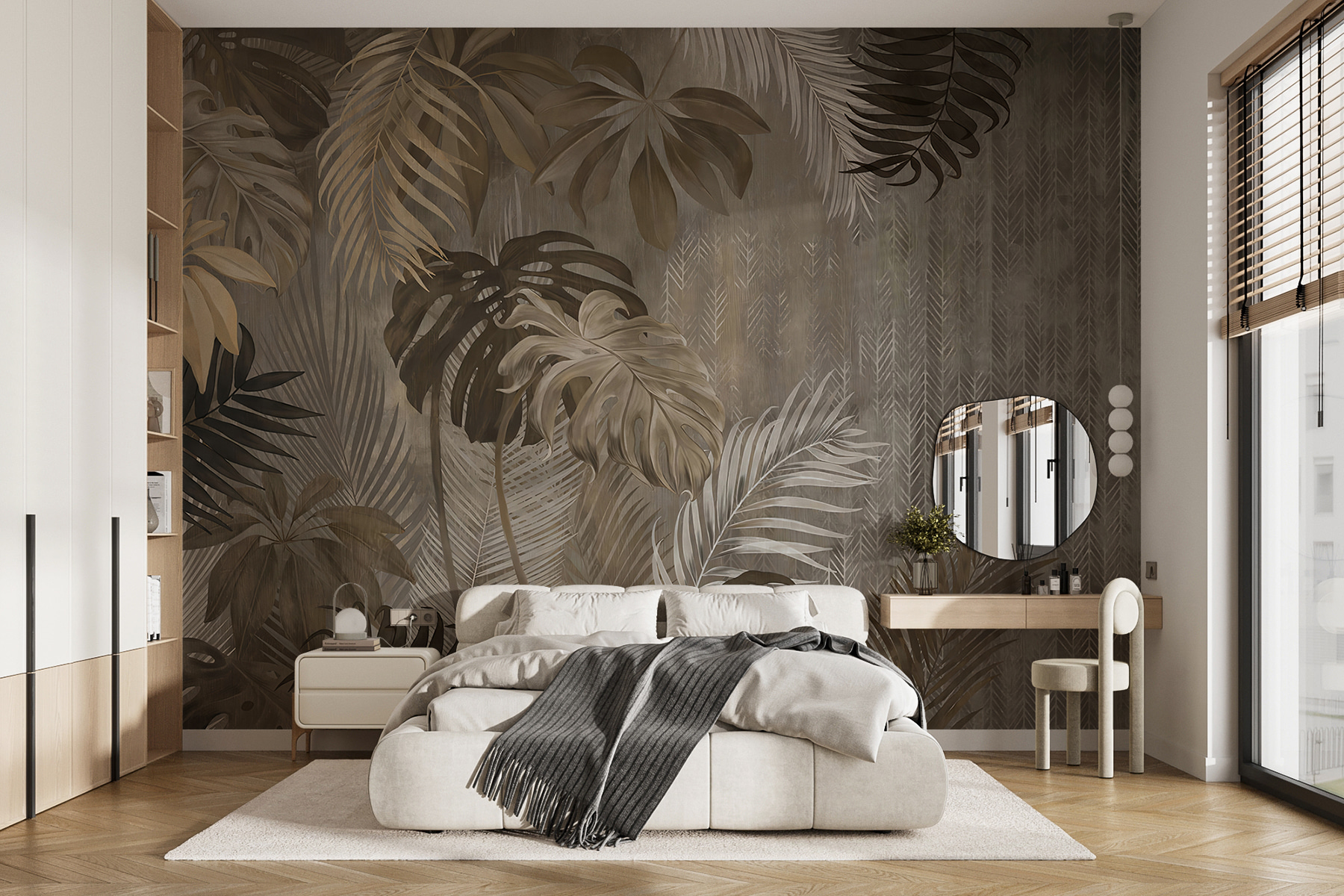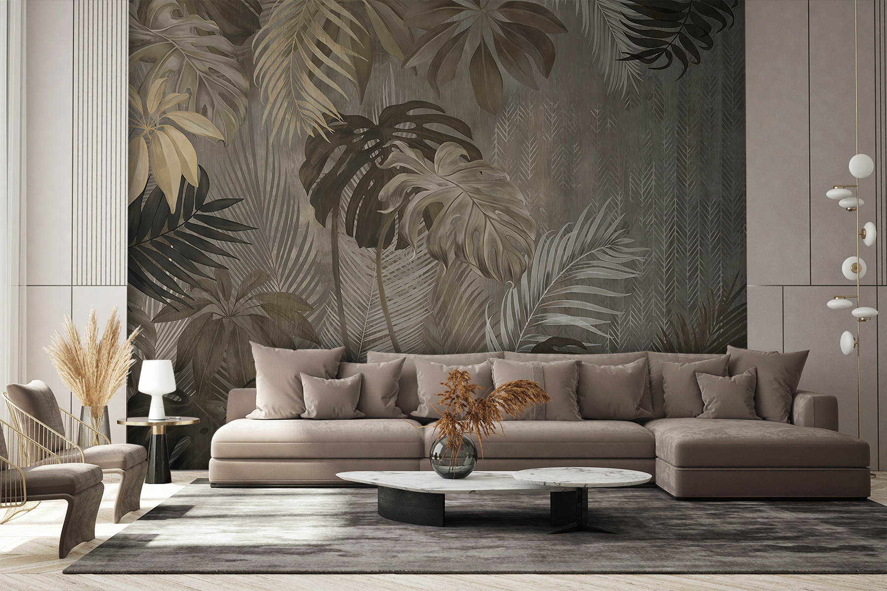 Proměňte nudnou stěnu v tropický ráj pomocí této nástěnné malby s elegantními listy na krásně pestrém pozadí. Představte si, že vstoupíte do útulného pokoje a budete mít pocit, že jste se zatoulali přímo do svěží džungle – samozřejmě bez komárů. Zemité tóny vyzařují klidnou atmosféru a zahalí vás do hřejivé náruče. Ideální pro ty, kteří touží po přírodě, ale žijí daleko od ní. Přátelé se vás možná zeptají, jestli jste si vyrazili na dovolenou do deštného pralesa! Je to víc než umění, je to každodenní únik, způsob, jak pozvat kousek přírody, aniž byste museli opustit domov.
