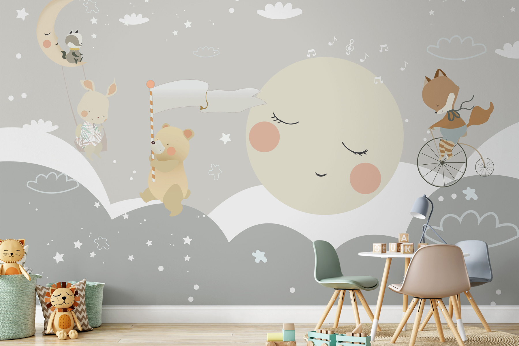 Podívejte se na tuto rozkošnou nástěnnou malbu “Bílá hvězda na šedém pozadí”. Je to jako vstoupit do zasněného příběhu na dobrou noc, který se skvěle hodí do dětského pokoje nebo herny. Tato fototapeta má uklidňující šedé pozadí posypané blikajícími hvězdičkami, dřímajícím měsícem a roztomilými zvířecími kamarády. Představte si ospalého medvěda a lišku jedoucí na penny-farthingu – naprosté potěšení pro malé objevitele!