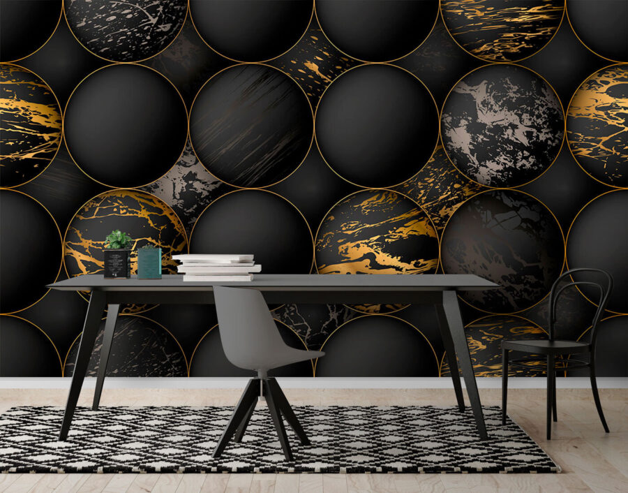 Proměňte obyčejnou stěnu v poutavé dílo pomocí této nástěnné malby s černými koulemi a výraznými mramorovými vzory. Představte si to: útulný obývací pokoj plný smíchu a hosté obdivující skvělý design na stěně. Má to moderní atmosféru s nádechem dramatického vkusu, který dokáže zcela navodit náladu. Možná sledujete nový seriál a vaše pozadí jen zvýší estetickou hru. Tyto odvážné koule vytvářejí pocit hloubky, díky čemuž se každá místnost zdá být větší a živější. Ideální pro ty, kteří chtějí do svého prostoru vnést trochu osobitosti a údernosti. Proč se spokojit s nudou, když vaše stěny mohou vyprávět příběh?