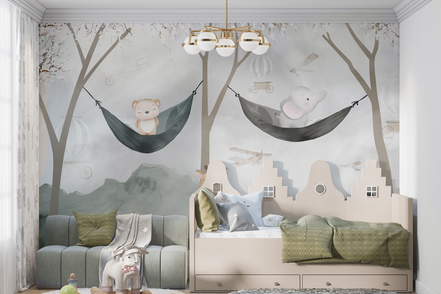 Tato rozmarná fototapeta vás zavede přímo do okouzlující lesní scény, kde se roztomilá panda a její zvířecí přátelé jen tak poflakují – doslova! Představte si to: medvídek, žirafa a slon leží v měkkých houpacích sítích zavěšených mezi zasněnými stromy. Panda samozřejmě zkoumá dění na zemi. Pozadí? Mlžné hory s klasickými letadly a horkovzdušnými balóny, které se jemně vznášejí kolem.