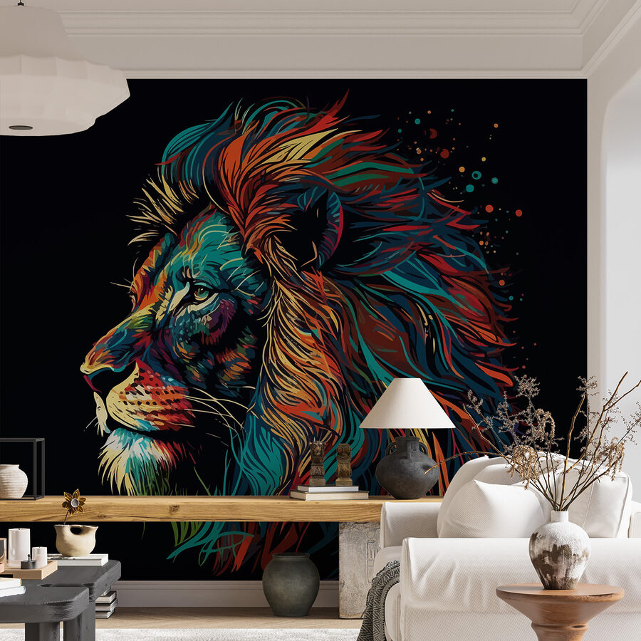 Představujeme vám úžasnou nástěnnou malbu, která vnese do každého prostoru kapku života – pozdravte barevného lva s dlouhou hřívou! Představte si, že vejdete do místnosti, kde vás přivítá tento živý, poutavý lev s hřívou plnou barev, která připomíná západ slunce rozplývající se na obzoru. Je to jako mít kousek divočiny přímo na zdi!