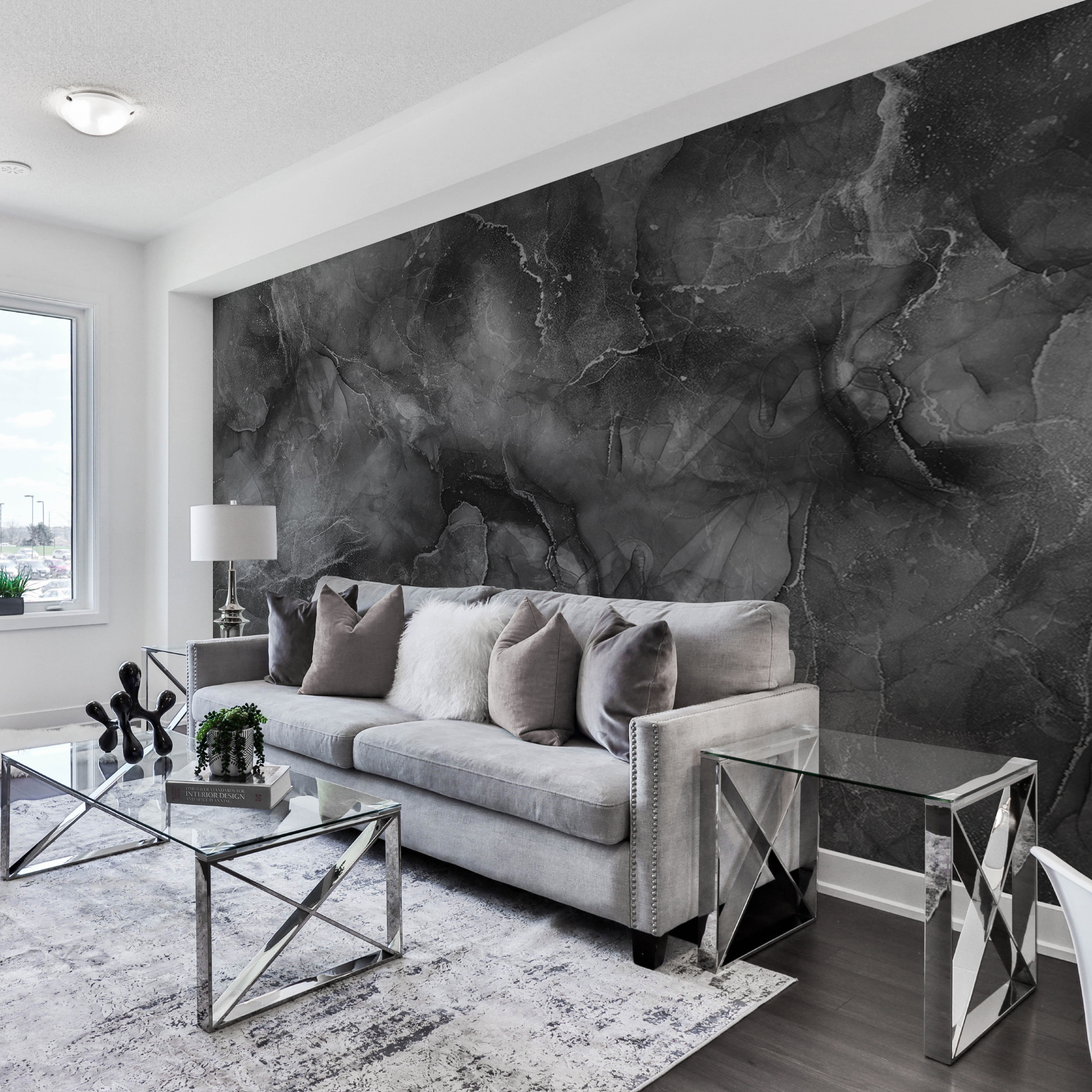 Proměňte jakýkoli prostor v útulné útočiště pomocí této nástěnné malby s úžasnou mramorovou strukturou a abstraktními vzory. Představte si, že vejdete do místnosti, která našeptává sofistikovanost, aniž byste potřebovali pozvánku na luxusní večeři. Víry tančí v sytě šedé a černé barvě, takže je snadné je kombinovat s téměř jakýmkoli barevným schématem – ať už se jedná o zářivé barvy nebo tlumené tóny.