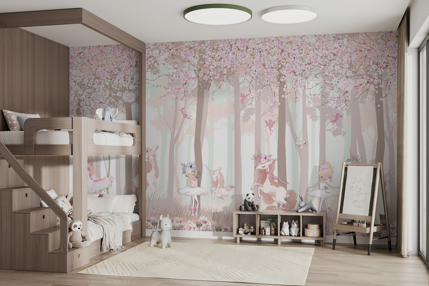 Jemné květiny a hravé víly přinášejí pocit klidu a radosti, zatímco měkký vzhled dřeva dodává teplo a útulnost. Vaše holčička si zamiluje fantazii a radost z toho, že má svůj vlastní kouzelný les přímo na stěnách! Je to jako sladké objetí z pokoje při každém vstupu dovnitř. Představte si pohádky před spaním obklopené touto kouzelnou kulisou – čiré dětské blaho.