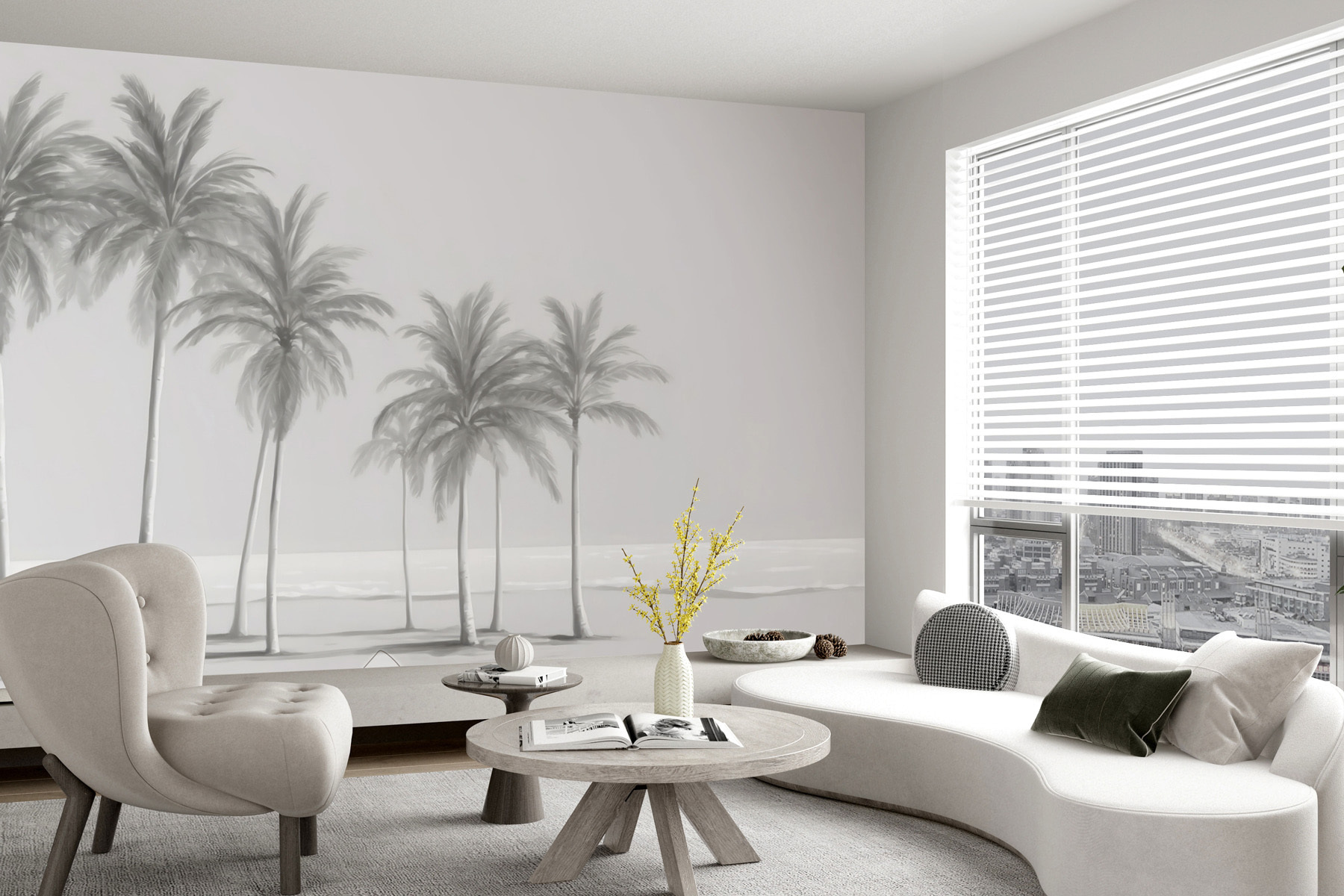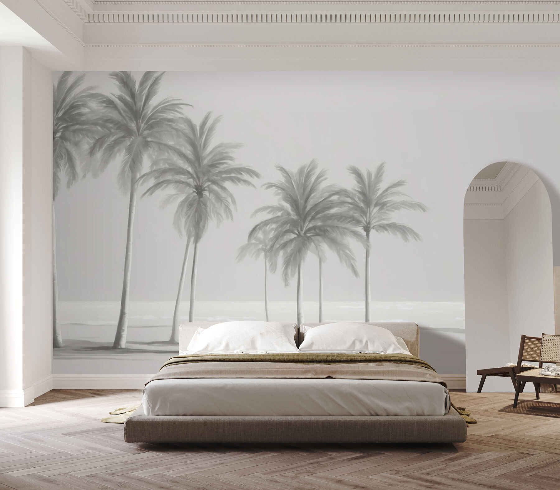 Tato nástěnná malba představuje výjev s několika vysokými elegantními palmami, které se jemně pohupují, jako by se jich dotýkal pobřežní vánek. Díky jemným, tlumeným barvám působí téměř snově, trochu jako vintage fotografie zachycující klidný den na pobřeží. Hodí se do jakéhokoli interiéru – moderního, boho, jak chcete. Navíc je velmi uklidňující; takový pohled, který vás okamžitě donutí vydechnout.