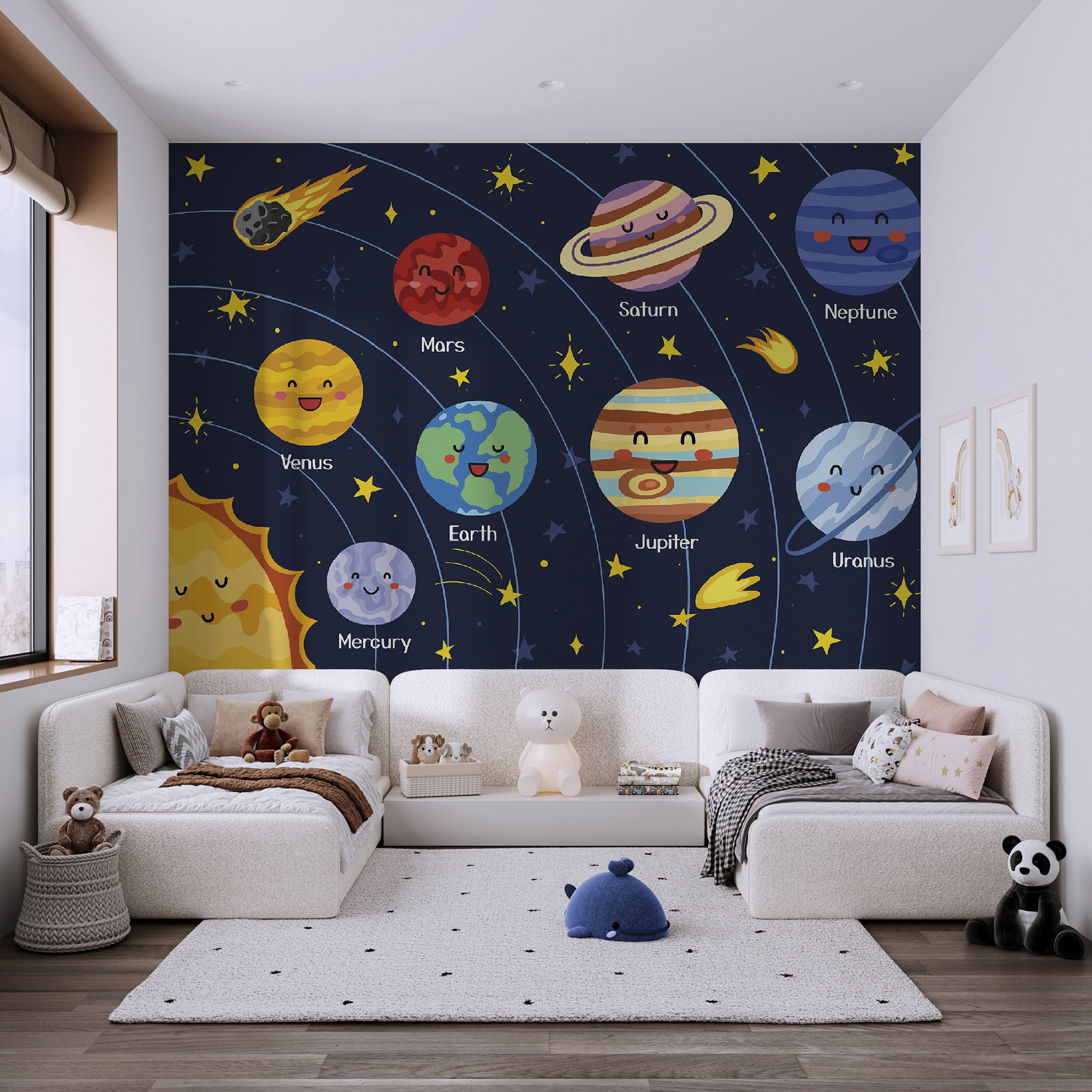 Chcete ozvláštnit dětský pokoj kouzlem z jiného světa? Podívejte se na tuto rozkošnou nástěnnou malbu “Kreslená planeta”! Je ideální pro malé astronauty a hvězdáře a obsahuje zábavný a barevný výjev galaxie. Planety mají ty nejroztomilejší obličeje – skoro si říkají o plácnutí. Představte si, jak se tvář vašeho dítěte rozzáří, až bude usínat ve vesmíru, který je zcela jeho vlastní.