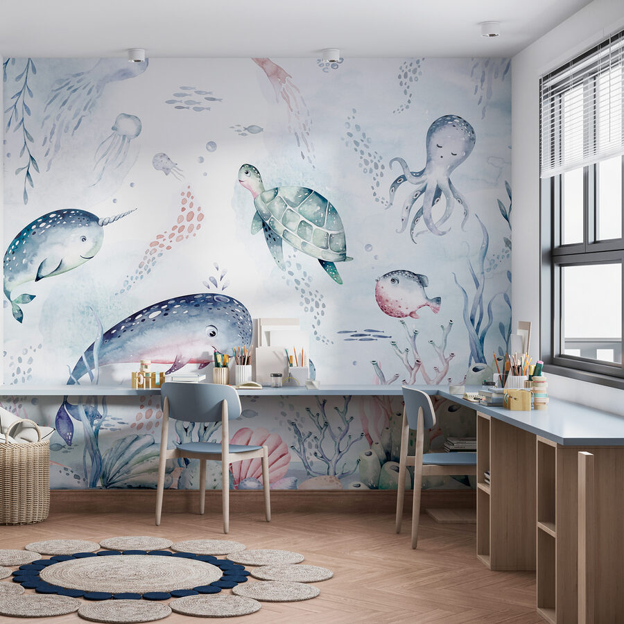 Ahoj! Představujete si někdy, že se při každém vstupu do místnosti přenesete do snového podmořského světa? Tato akvarelová nástěnná malba vám pomůže. Je to jako rozmarná sprška oceánského kouzla, doplněná super pohodovou želvou, která klouže po okouzlujícím moři. Ideální pro děti, kojence nebo kohokoli, kdo je fanouškem přímořské atmosféry. Tlumené, ale živé barvy vytvářejí klidnou, téměř hravou oceánskou scénu s rozkošnými mořskými tvory, kteří se vznášejí kolem – máte pocit, jako by vaše stěny políbil sám oceán. Není to jen dekorace, je to mini dobrodružství, které čeká, až se stane!