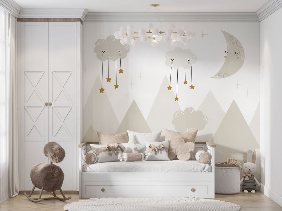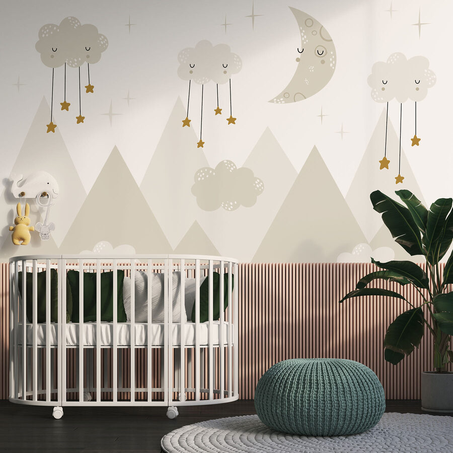 Představte si to: zasněná freska noční oblohy s ospalým měsícem a útulnými mraky s hvězdami, které jemně září nad vrcholky hor. Je to jako vstoupit do rozmarné pohádky na dobrou noc! Tato nástěnná malba, která se skvěle hodí do dětského pokoje nebo pokojíčku, spojuje představivost a pohodlí – podněcuje kreativitu malého dítěte a zároveň vytváří uklidňující atmosféru. Pomyslete na všechny ty sladké sny a chichotání před spaním. Kdo by navíc nechtěl usínat pod takovým rozkošným a uklidňujícím výjevem? Je to víc než jen dekorace – je to malé dobrodružství přímo na zdi.