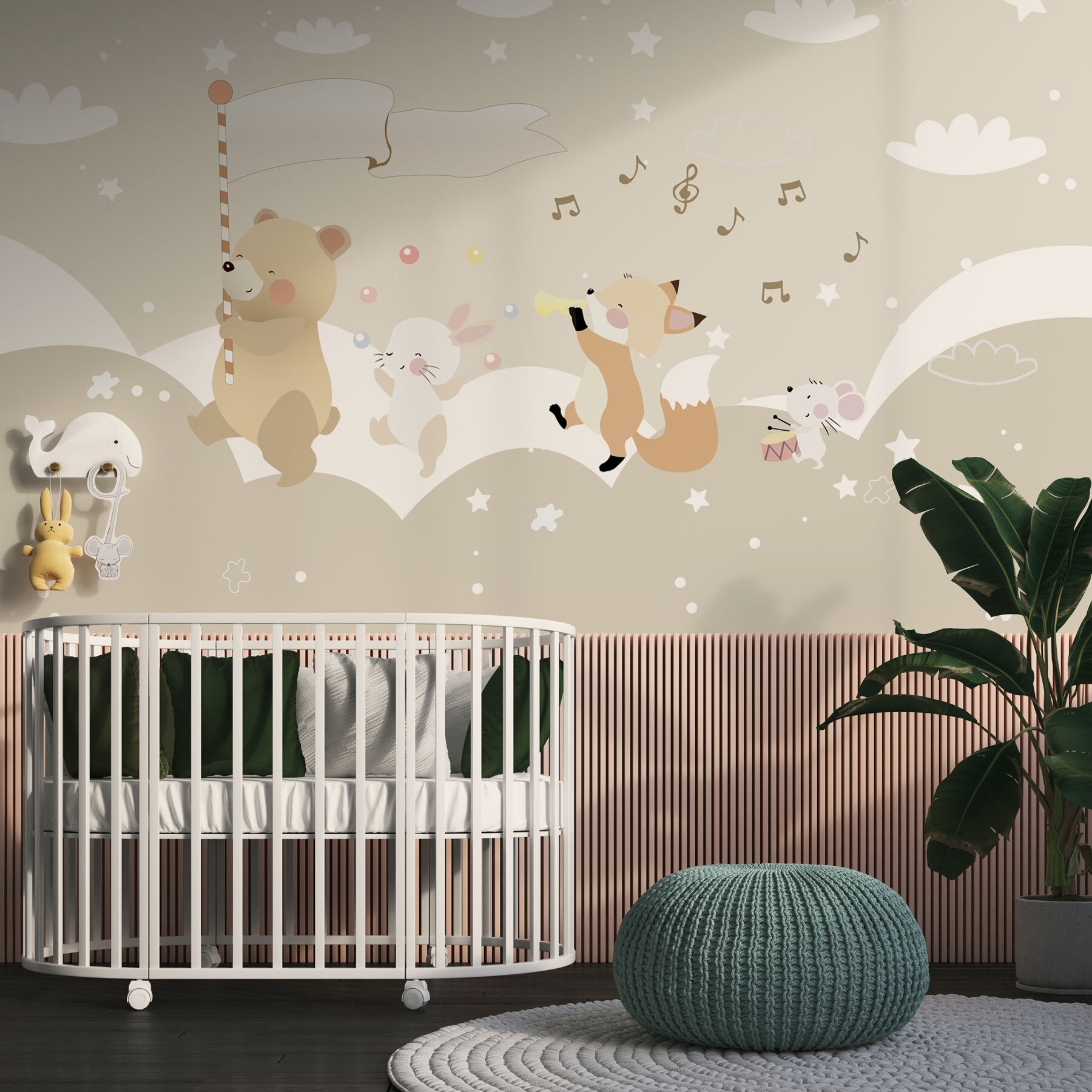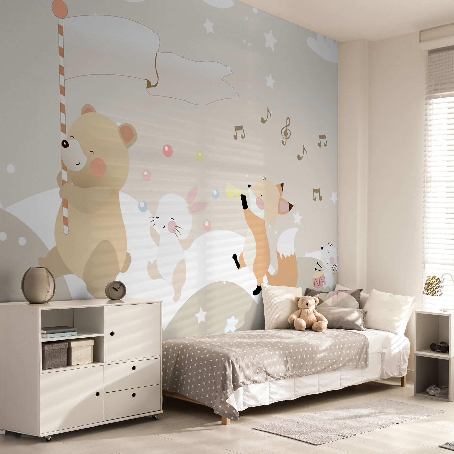 Proměňte dětský pokoj v rozmarnou říši divů s touto nádhernou fototapetou s veselým medvídkem a jeho veselou partou lesních přátel. Představte si, jak se malé děti probouzejí do hravého výjevu, kde medvídek mává cukrovou třtinou jako vlajkou a zve ke snům plným sladkostí a zábavy. Kolem tančí liška a poskakuje zajíček; je to jako malá přehlídka přímo na zdi! Jemné barvy a radostné výrazy vytvářejí uklidňující atmosféru a podněcují fantazii a smích. Ideální do dětských pokojů nebo dětských pokojíčků, je to druh dekorace, která promění každodenní okamžiky v dobrodružství – kdo ví, jaké příběhy se zde budou odehrávat? Jednoduchý dotek, který udělá velký dojem!
