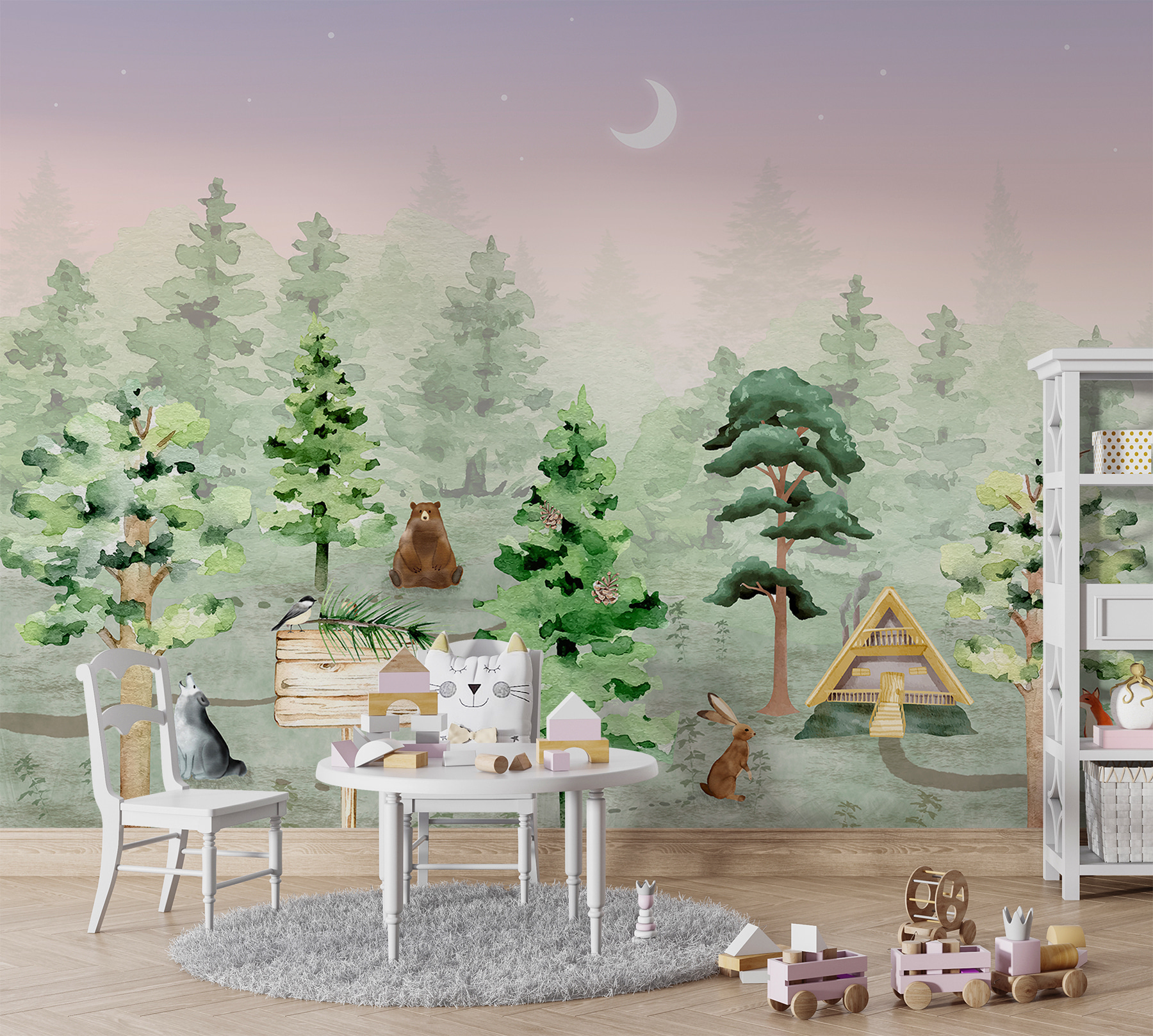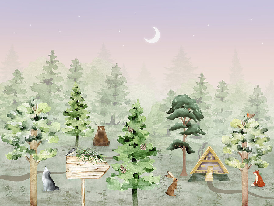 Představte si kouzelný les přímo u vás doma – na této krásné fototapetě je roztomilý ptáček sedící na dřevěné ceduli, který vás zve do rozmarné lesní scény. Kolem se shromažďují zvířecí kamarádi, z nichž každý přidává nádech kouzla a dobrodružství. Ideální do dětských pokojů, jako byste každý den vstupovali do oblíbené pohádkové knihy. Díky jemným, uklidňujícím barvám působí zvířátka jako přátelští společníci. Děti budou rády pozorovat lišku, králíka a starého moudrého medvěda, když budou usínat. Měsíční světlo dodává pohádce kouzelný nádech, takže čas před spaním je ještě o něco kouzelnější. Není to jen nástěnná malba, je to cesta do snového lesa, která v malých srdcích podnítí představivost a lásku k přírodě. Kdo by nechtěl mít na zdi tento malý zázračný kousek?