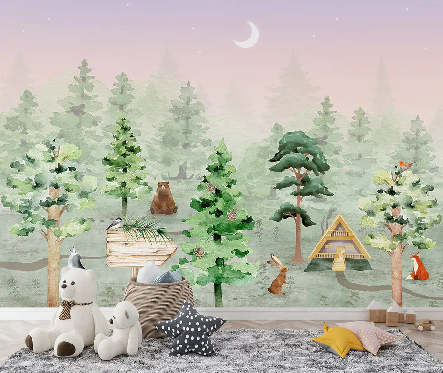 Představte si kouzelný les přímo u vás doma – na této krásné fototapetě je roztomilý ptáček sedící na dřevěné ceduli, který vás zve do rozmarné lesní scény. Kolem se shromažďují zvířecí kamarádi, z nichž každý přidává nádech kouzla a dobrodružství. Ideální do dětských pokojů, jako byste každý den vstupovali do oblíbené pohádkové knihy. Díky jemným, uklidňujícím barvám působí zvířátka jako přátelští společníci. Děti budou rády pozorovat lišku, králíka a starého moudrého medvěda, když budou usínat. Měsíční světlo dodává pohádce kouzelný nádech, takže čas před spaním je ještě o něco kouzelnější. Není to jen nástěnná malba, je to cesta do snového lesa, která v malých srdcích podnítí představivost a lásku k přírodě. Kdo by nechtěl mít na zdi tento malý zázračný kousek?