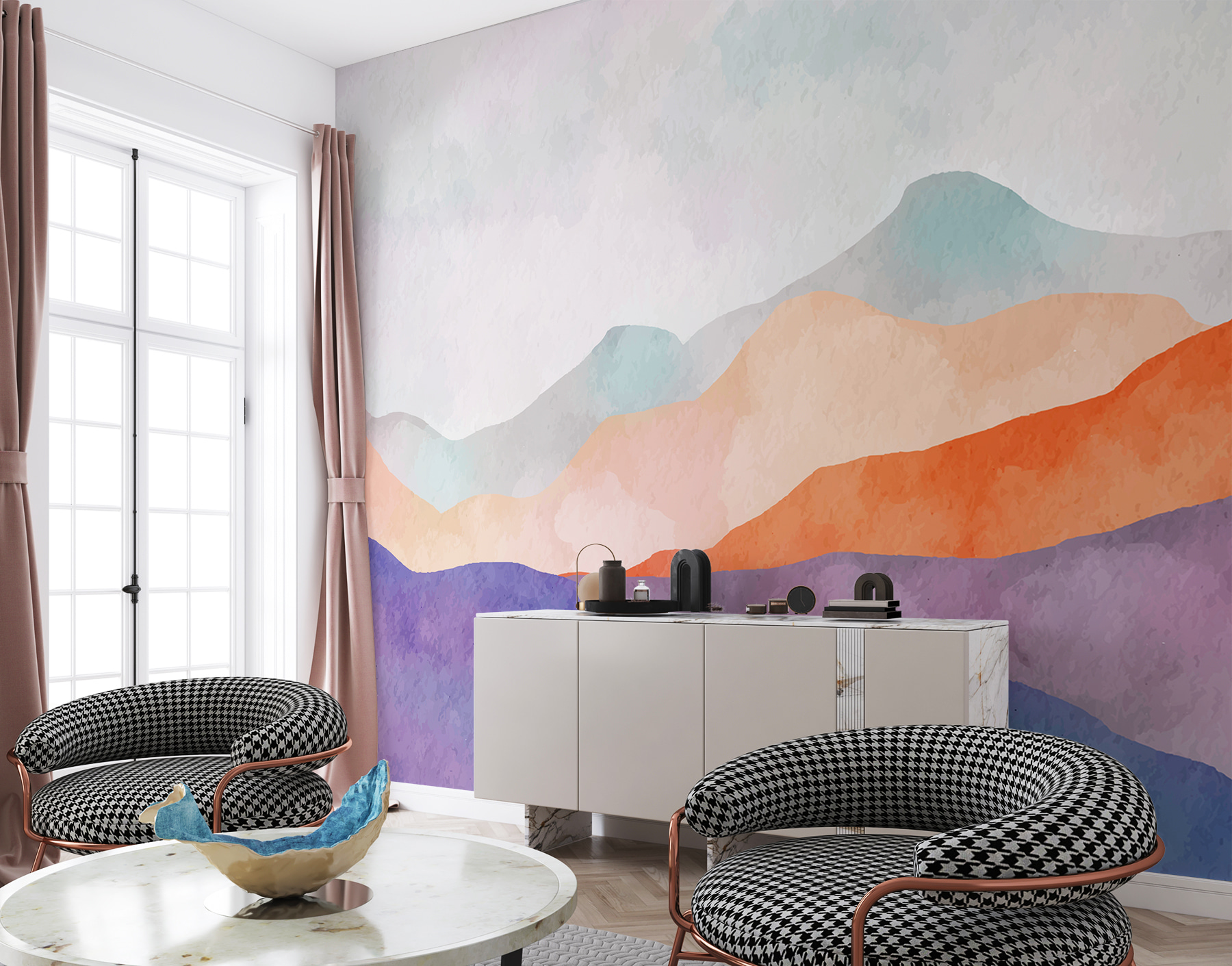 Přemýšleli jste někdy o procházce akvarelovou snovou krajinou přímo ve vašem obývacím pokoji? Přesně takovou atmosféru na vás dýchne tato nástěnná malba. Jako by někdo zachytil esenci jemného, mlhavého rána v horách a rozstříkl ji po vaší zdi. Směs barev je tak uklidňující – pastelová modř, jemná oranžová a fialová, které se slévají jako klidný západ slunce. Představte si, že usrkáváte kávu, vzhlédnete a okamžitě se cítíte uvolněně – skoro jako byste se dívali z okna chaty na vzdálené vrcholky. Ideální pro každého, kdo má rád dobrou atmosféru přírody.