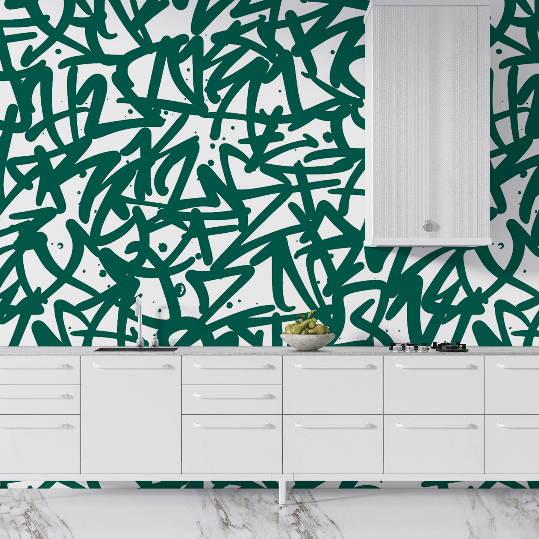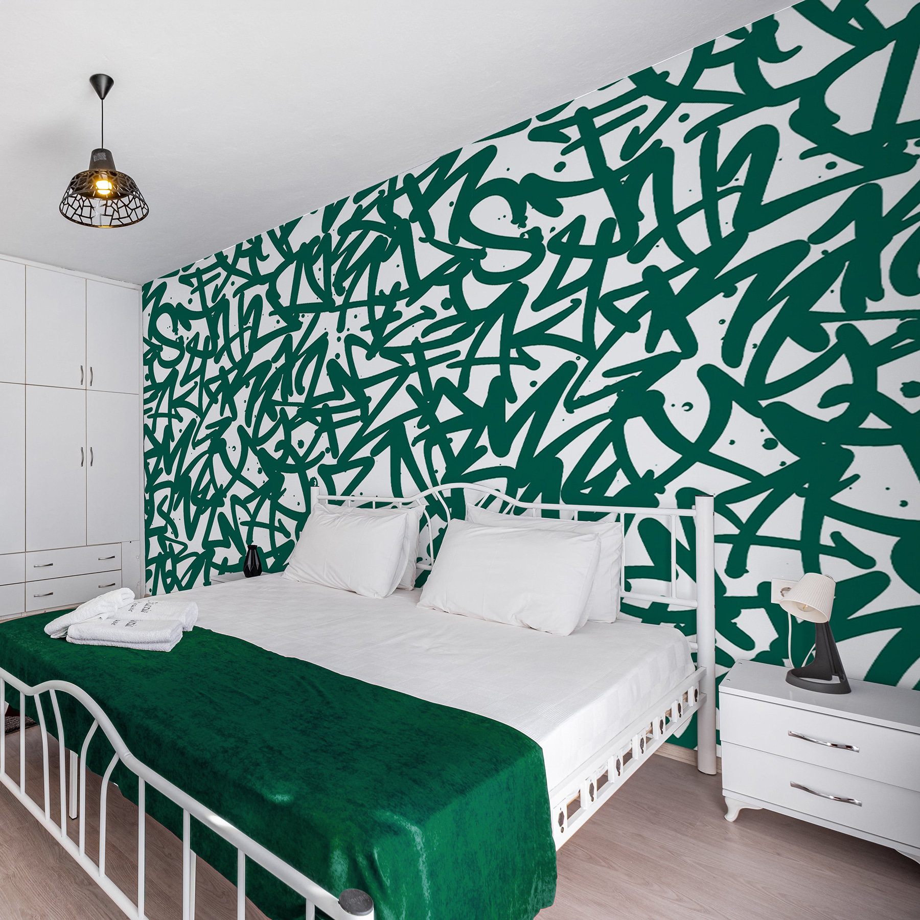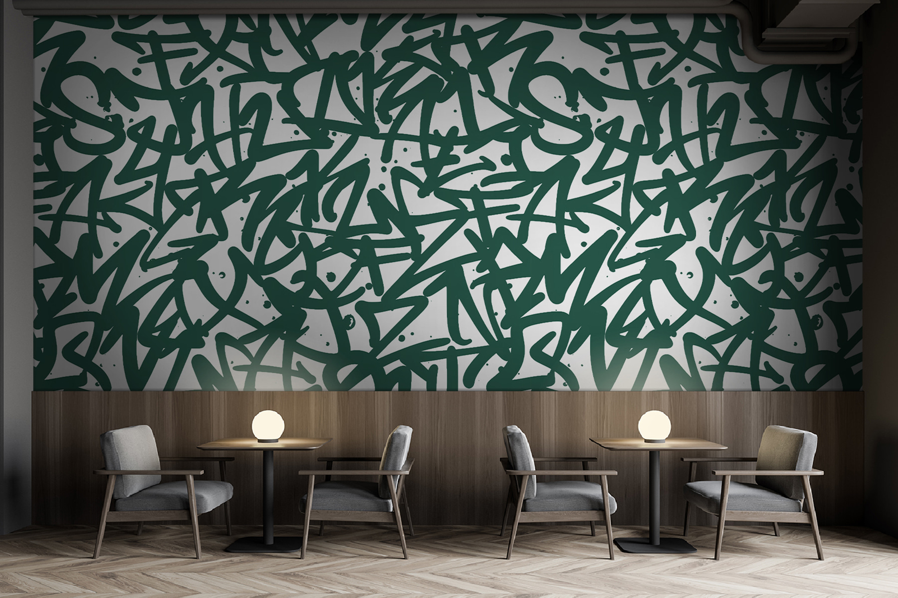 Tato nástěnná malba “Vzor zelených písmen” je jako ten vzrušující chaos myšlenek před prvním douškem ranní kávy. Čmáranice? Jistě. Čistá tvůrčí energie? Určitě. Představte si, jak tyto oduševnělé zelené čmáranice tančí po vaší zdi a šeptají každému kolemjdoucímu svérázná tajemství. Je to pro dny, kdy inspirace připomíná maraton – rychlý, trochu nezvladatelný, ale tak uspokojivý. Ideální pro prostor, který potřebuje trochu hravého chaosu nebo špetku uměleckého vkusu. Kdo by řekl, že dopisy mohou působit jako večírek?