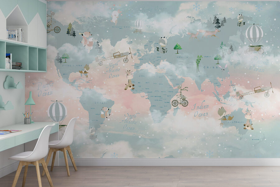 Tato nástěnná malba “Mapa světa s mraky a zvířaty” není typickou nástěnnou dekorací – je to rozmarné dobrodružství, které čeká na své rozvinutí! Je ideální pro malé objevitele a snílky, protože obsahuje jemnou pastelovou mapu s půvabnými ilustracemi zvířat a nadýchanými mráčky. Představte si, jak se vaše miminko nebo malé dítě dívá na tuto nástěnnou malbu a vydává se na imaginární cestu ze Severní Ameriky do Afriky se zvědavými zvířátky jako svými společníky.