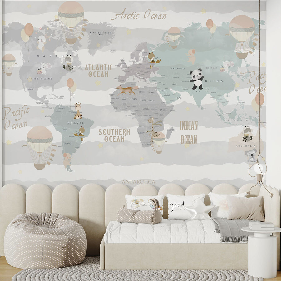 Tato rozkošná fototapeta “Horkovzdušný balón na obloze” přenese fantazii vašeho dítěte na kouzelné dobrodružství. Představte si mapu světa, krásně jemnou a pastelovou, pokrytou těmi nejroztomilejšími zvířátky v horkovzdušných balonech – je tu dokonce i hravá panda a zvědavá žirafa! Je to jako globální safari přímo na zdi. Tato nástěnná malba, která se skvěle hodí do dětského pokoje nebo hravého dětského pokoje, podporuje úžas nad velkým, širým světem. Zaručeně inspiruje k vyprávění příběhů před spaním o létání nad třpytivými oceány a přistávání v dalekých zemích. Ideální pro malé objevitele – rodiče se možná také přistihnou, jak se zasní. Je útulný, rozmarný a plný kouzla – přesně to, co potřebuje každý dětský pokojíček!