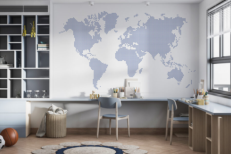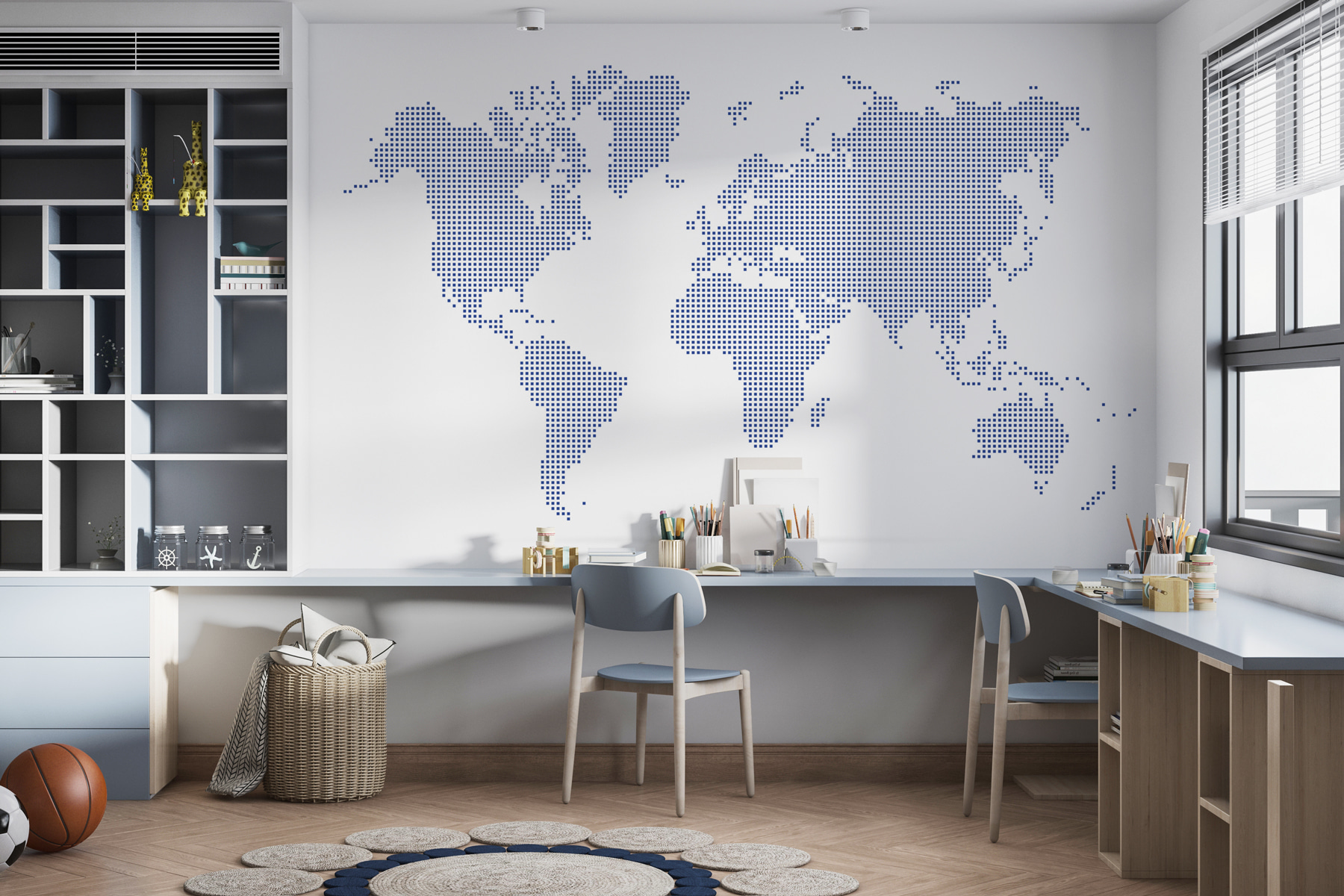 Přemýšlíte, jak vylepšit svůj prostor? Podívejte se na tuto hvězdnou nástěnnou malbu s názvem “Mapa světa”. Je to elegantní, umělecké pojetí typické mapy, na níž jsou kontinenty znázorněny spoustou drobných teček. Tato kráska se umístila v kategoriích “Nástěnné malby s mapou Země” a “Populární nástěnné malby” a je snadné pochopit proč. Představte si, že se táhne přes celou stěnu vašeho obývacího pokoje – určitě se s vámi dá mluvit! Představte si hosty, jak obdivují vaši globální atmosféru a nenuceně plánují své další dobrodružství. Navíc je něco zvláštně uspokojivého na tom, když vidíte takto rozložený svět. Přidat tuto nástěnnou malbu do svého prostoru? Je to jako pozvat celý svět k sobě domů.