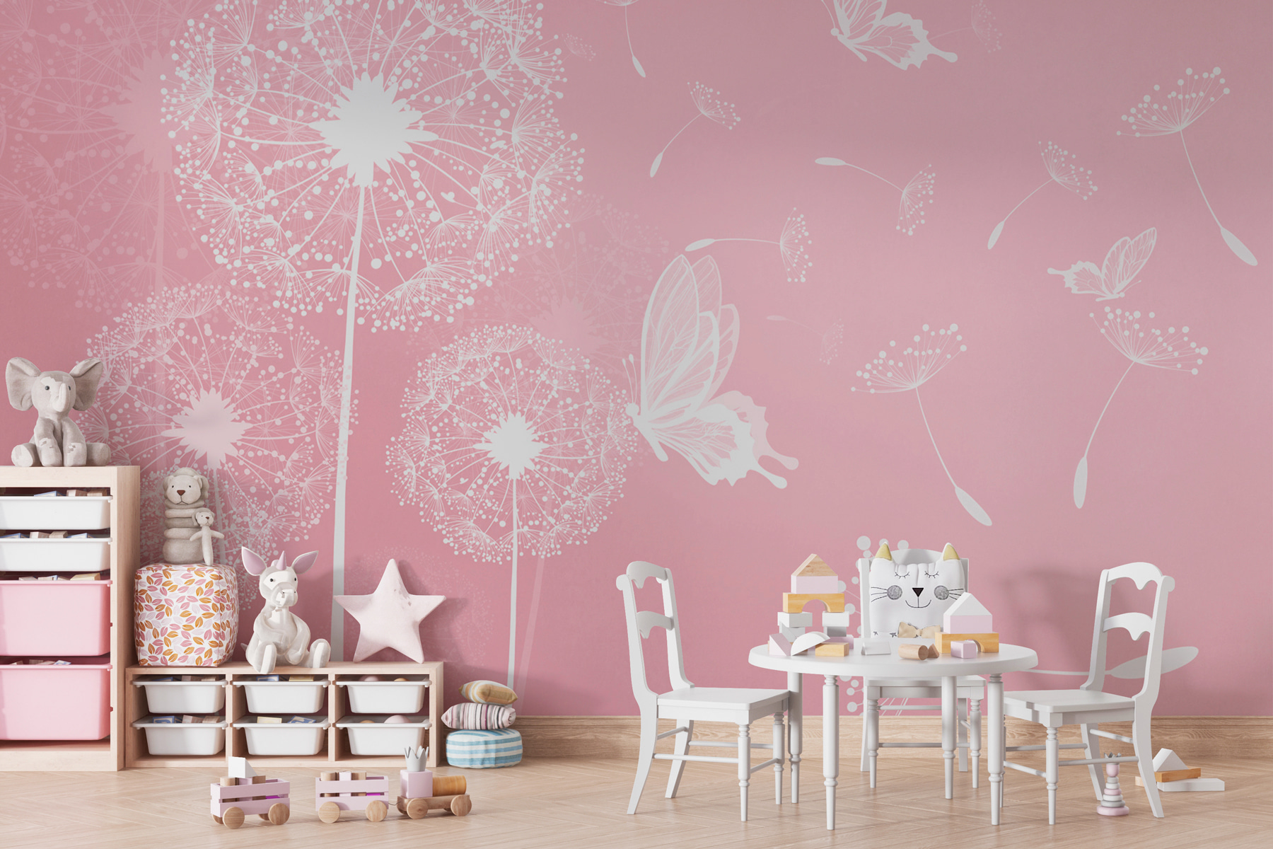 Podívejte se na tuto zasněnou nástěnnou malbu s bílými květy na růžovém pozadí! Je to jako závan čerstvého vzduchu – ideální pro přidání nádechu rozmarnosti do každé místnosti. Představte si, že vejdete do svého prostoru a okamžitě se budete cítit povzneseně díky jemným, křehkým bílým pampeliškám, které se ladně vznášejí na pozadí té krásné pastelově růžové. Je to uklidňující a zároveň hřejivé, jako když zahlédnete jarní zahradu rozkvetlou přímo v interiéru. Ideální do útulných obývacích pokojů, klidných ložnic, nebo dokonce hravých dětských pokojů – tato nástěnná malba přináší kapku kouzla přírody a mění obyčejné stěny v okouzlující plátna. A ti motýli? Naprosto kouzelní! Určitě vykouzlí úsměv na tváři každému a dodají vašemu všednímu dni trochu pohádkového kouzla. Navíc jsou dostatečně univerzální, aby doplnily různé styly dekorací, od minimalistických až po vintage chic. Tak si to jen představte – klidné útočiště u vás doma s touto nádhernou nástěnnou malbou jako kulisou.