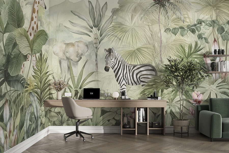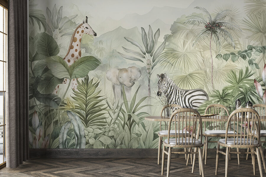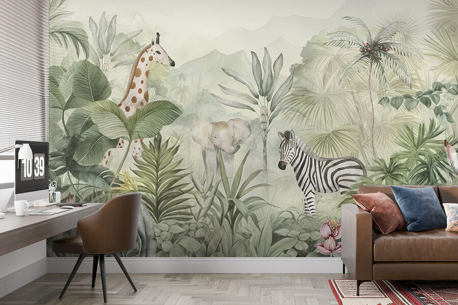 Představte si, že vstoupíte do džungle plné života – ale ve svém vlastním pokoji! Tato nástěnná fototapeta “Zvířata se potulují klidnou krajinou džungle” je čirým kouzlem pro oči. Sloni, zebry a žirafy se poklidně procházejí touto svěží zelení, která je tak živá, že téměř ucítíte vlhkost! Je ideální pro děti a kojence, je uklidňující směsicí dobrodružství a klidu, která podněcuje i tu nejdivočejší fantazii. Díky jemným pastelovým barvám a složitým detailům vynikne v každém prostoru. Ideální pro milovníky přírody nebo pro ty, kteří chtějí prostě uniknout – aniž by museli opustit domov.