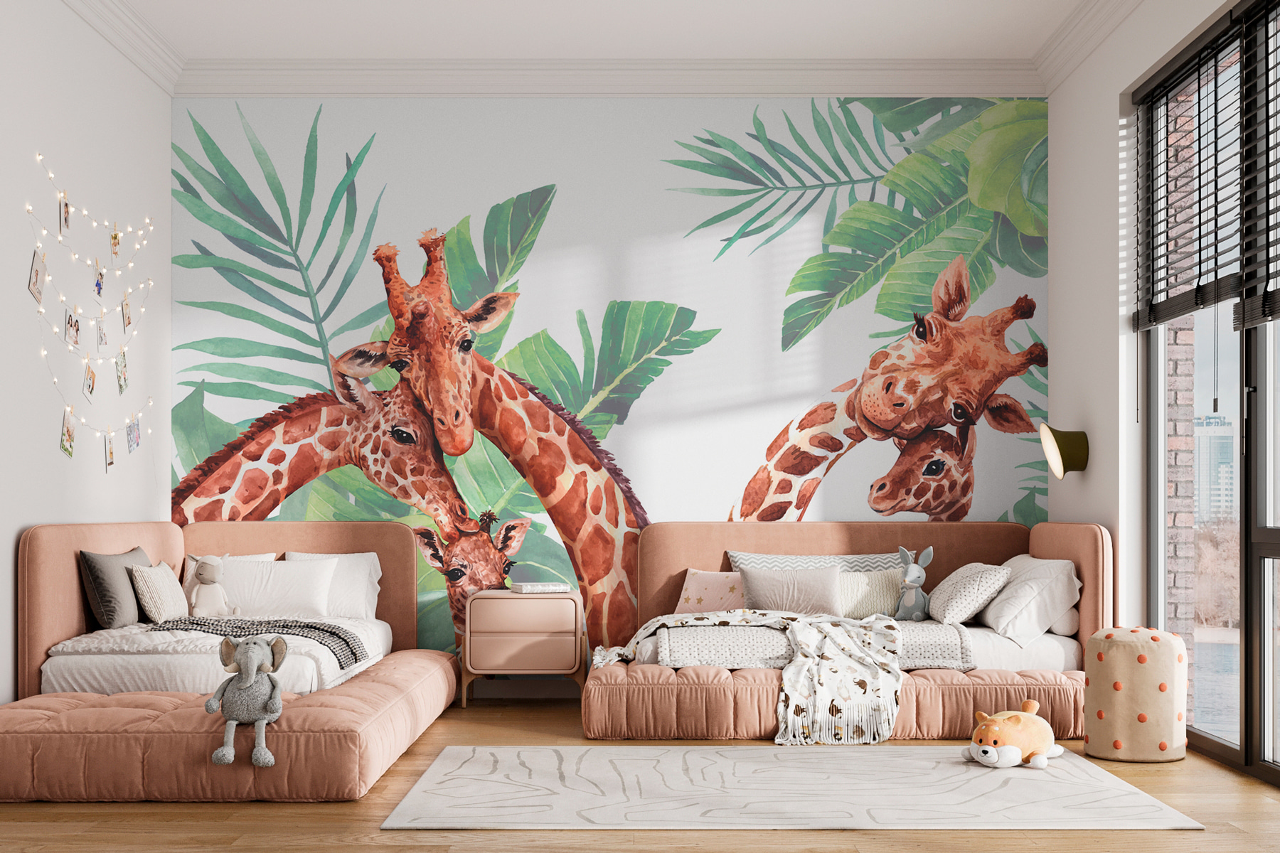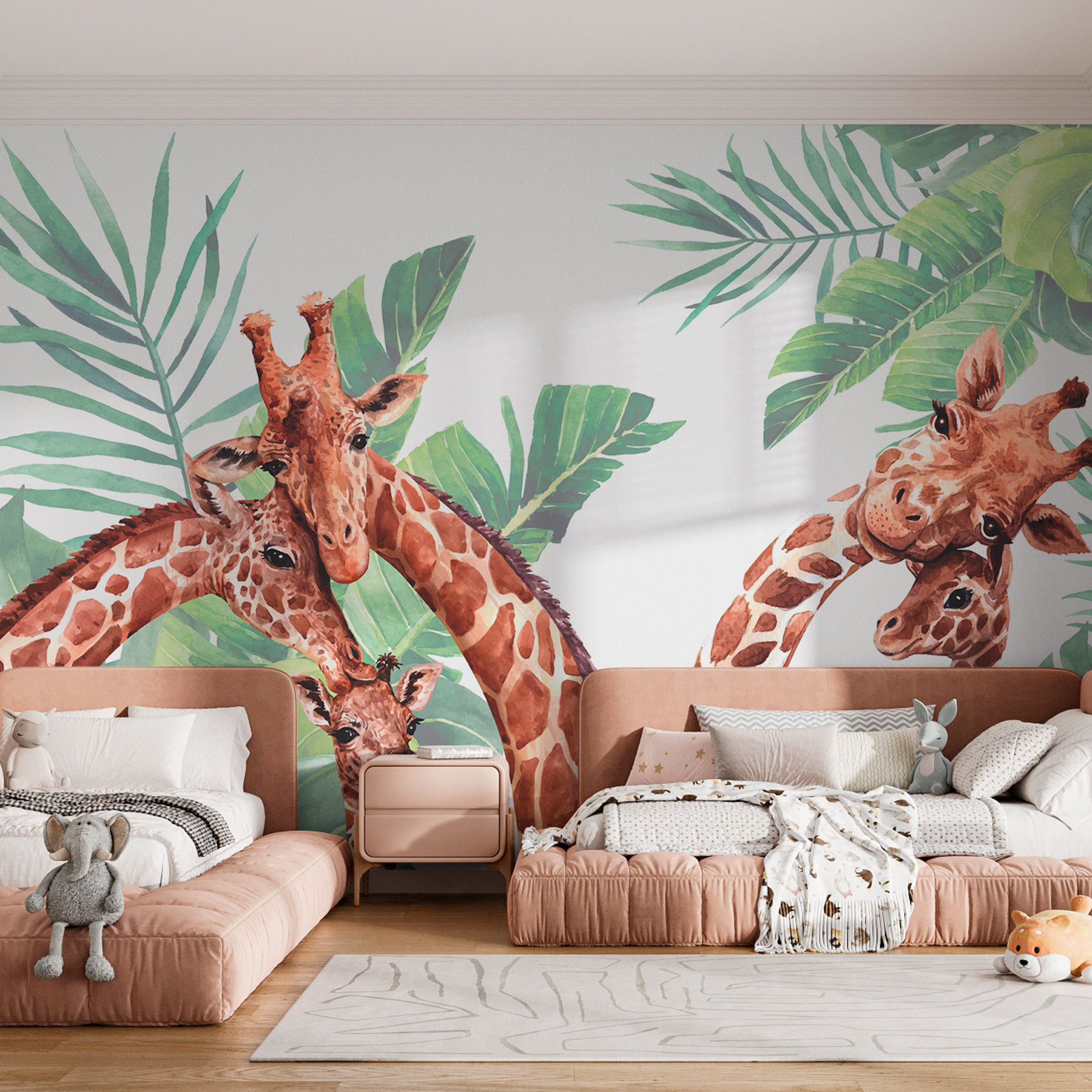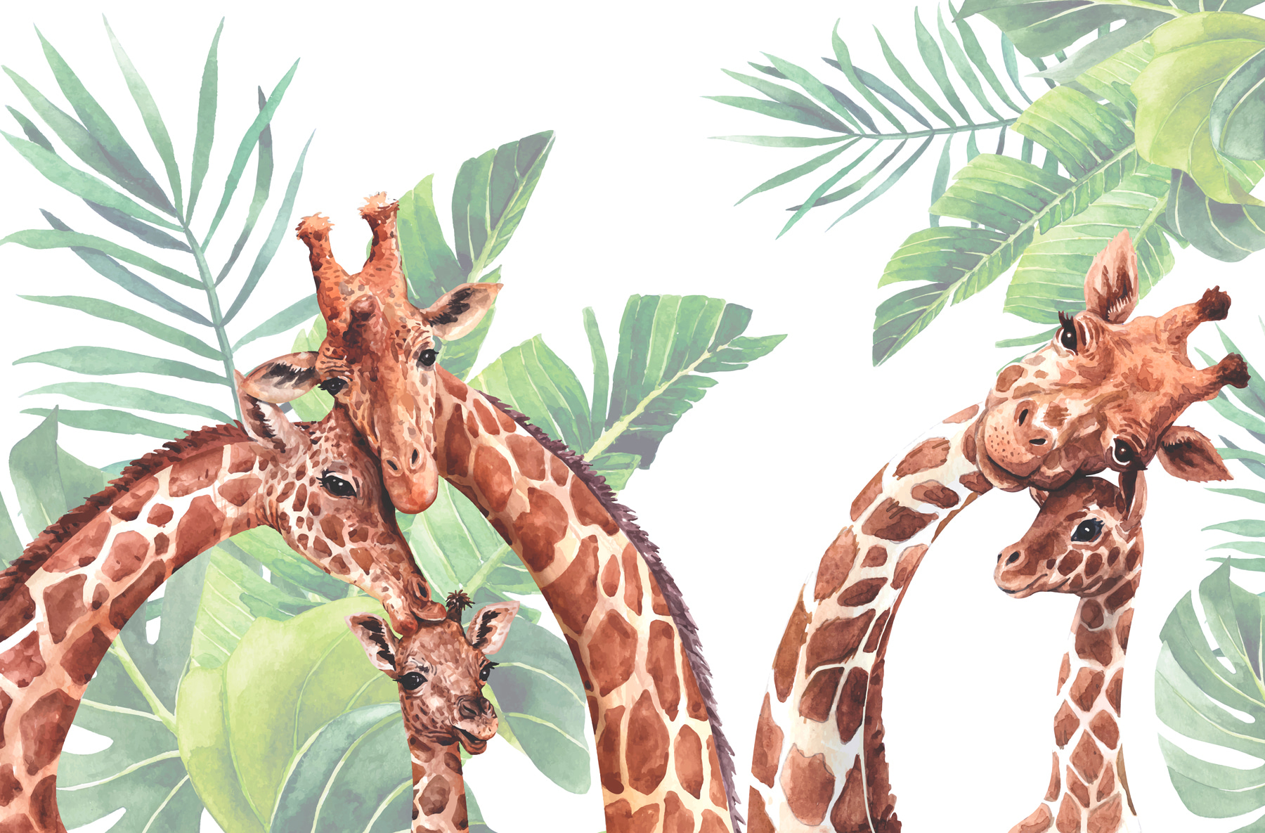 Představte si, že se ráno probudíte s okouzlující žirafí rodinkou, která vás mile přivítá! Fototapeta “Skupina žiraf s listy” je jako veselé safari dobrodružství přímo na vaší zdi. Tyto žirafy se svýma laskavýma očima a zvědavým výrazem se skvěle hodí do dětských pokojů nebo do jakéhokoli hravého prostoru a díky nim bude vše působit ještě o něco kouzelněji. Svěží zelené listy navíc dodávají svěží, uklidňující atmosféru. Skoro jako byste slyšeli šumění listů a tiché šepotání žiraf. Skvěle se hodí k rozproudění fantazie a vytvoření rozmarného, přírodou inspirovaného útočiště u vás doma. Ať už se jedná o dětský pokoj vašeho děťátka, nebo o překvapení pro milovníka zvířat ve vašem životě, tato nástěnná malba vnese teplo a úžas do každé místnosti.