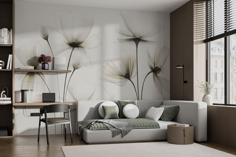Máte pocit, že by vaše stěny potřebovaly trochu magie? Podívejte se na tuto nástěnnou malbu s tak jemnými květinami, které se téměř vznášejí ve vzduchu. Měkké, průhledné okvětní lístky na čistě bílém pozadí působí tak klidně a uklidňujícím dojmem. Představte si, že se každý den probouzíte s touto krásou – jako byste měli vlastní klidnou zahradu bez nutnosti zalévání.