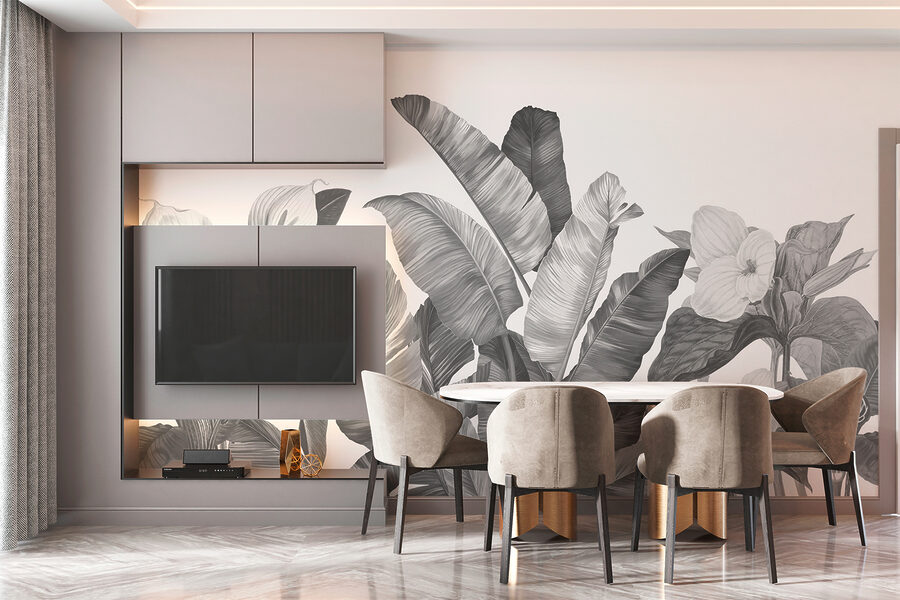 Představte si, že vejdete do pokoje a bum – jste ve svém vlastním tropickém ráji. Přesně to dělá tato nástěnná malba. “Monochromatické tropické listy a květy” není jen název, je to celá atmosféra. Přemýšlejte o tom – odvážné banánové listy se mísí s exotickými květinami, a to vše v uklidňující šedé škále, která nějakým způsobem působí klidně a elegantně. Ideální pro každého, kdo miluje džungli, ale obejde se bez komárů, že?