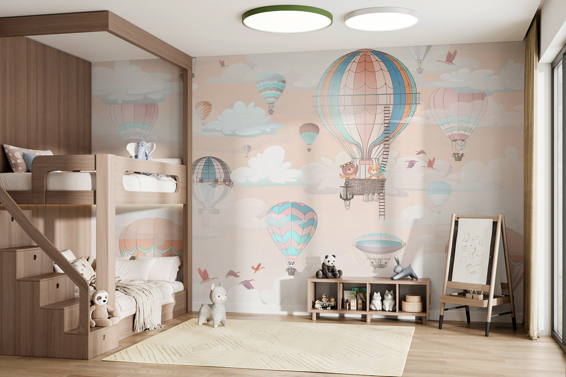 Tato nástěnná malba “Horkovzdušný balón v oblacích” je jako vstup do snu. Představte si, že se děti každé ráno probouzejí na oblohu plnou rozmarných horkovzdušných balónů, které se vznášejí v nadýchaných mracích. Je to okouzlující směs jemných pastelových barev – ideální pro vytvoření klidného, radostného prostoru. Představte si příběhy před spaním odehrávající se v dalekých zemích nebo hravá odpoledne s přáteli, inspirovaná tímto vzdušným dobrodružstvím. Není to jen nástěnná malba, je to celá nálada – lehká, hravá a naprosto kouzelná. Ideální do dětských pokojů nebo dětských pokojíčků, kam vnese nádech zábavy a nekonečné představivosti.