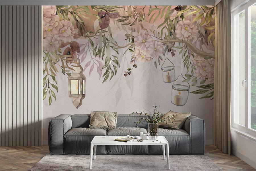 Představte si, že máte kousek vysněného zahradního zákoutí přímo na zdi. Tato nástěnná malba “Lampiony a květy vytvářejí snovou scénu” je jako vstup do klidné pohádky pokaždé, když vejdete do místnosti. Jemné růžové pivoňky a svěží zelené listí vnášejí do interiéru dotek přírody a vytvářejí prostor, který je uklidňující a inspirativní zároveň. Lucerny navozují útulnou, hřejivou atmosféru – skoro jako byste slyšeli jemné šustění listů a cítili vůni čerstvých květů.