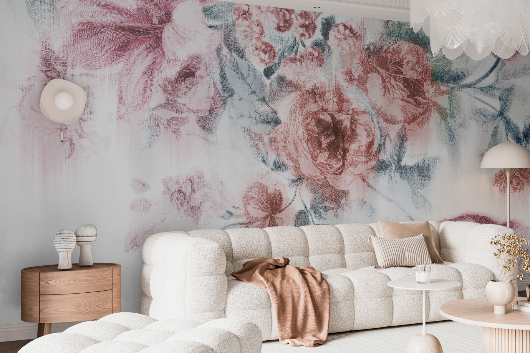 Tato nástěnná malba s názvem “Nástěnná malba Vintage květinový vzor v jemných odstínech” je jako vstup do zasněné zahrady z jiných časů. Představte si, že vejdete do svého pokoje a přivítá vás jemné kouzlo vintage květů – konkrétně pivoněk a růží, jejichž barvy jako by vám šeptaly do uší klid. Má to ty jemné akvarelové vibrace, a přesto je v tom něco nápadně detailního, co vás udrží přilepené na každém okvětním lístku a listu.