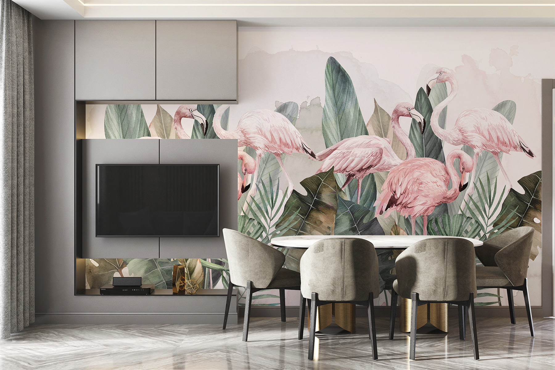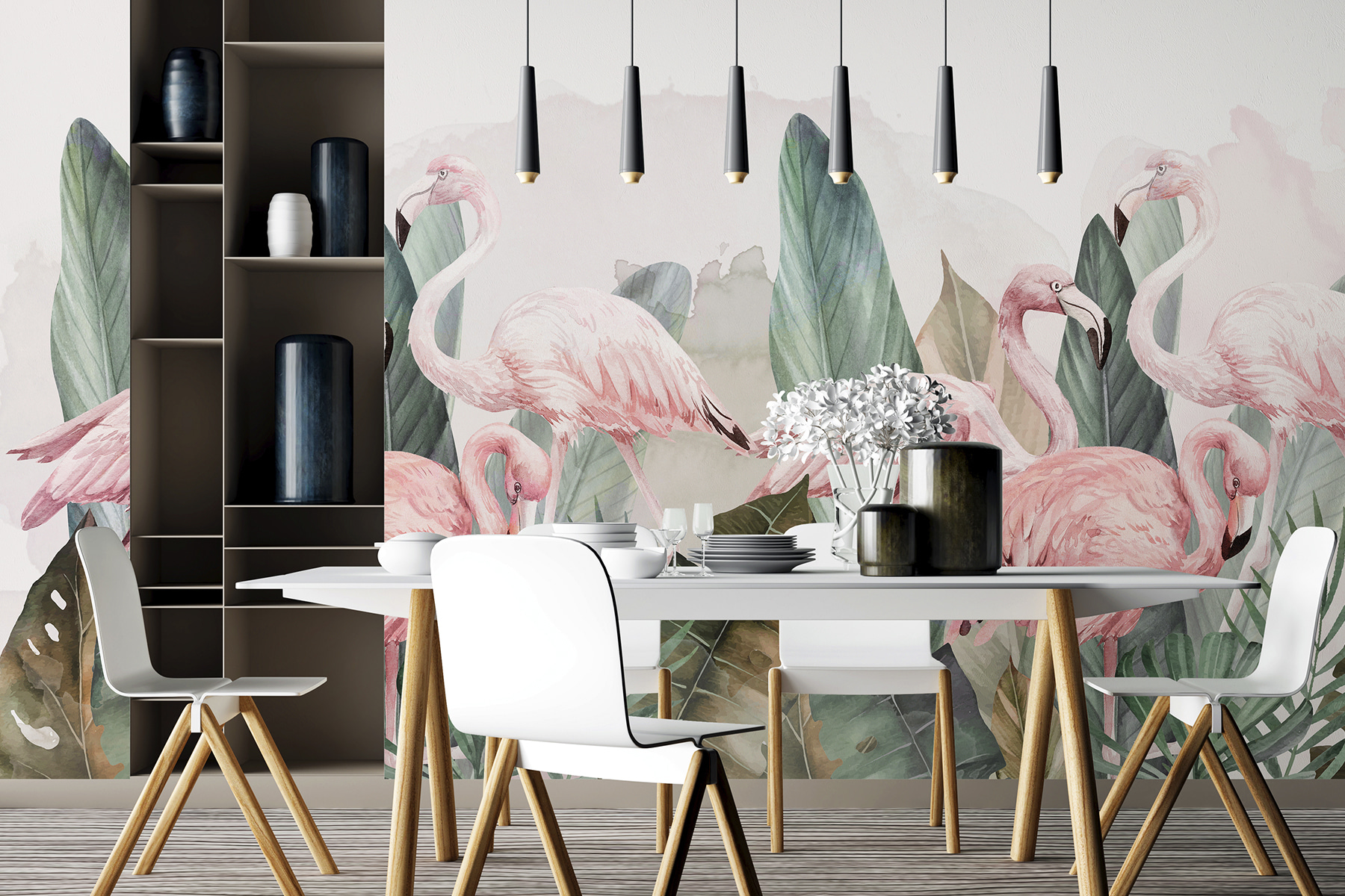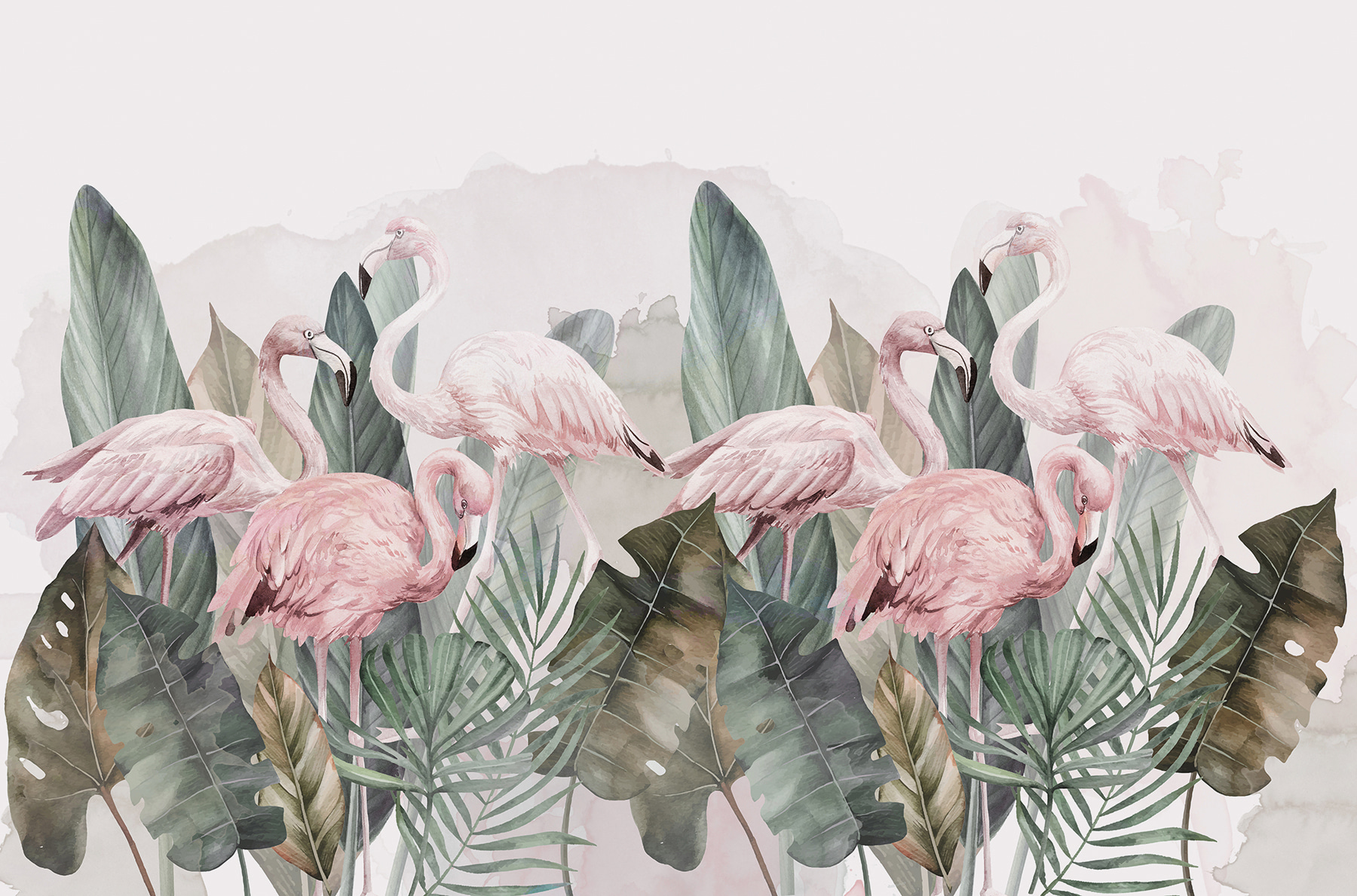 Jemná růžová a zelená působí uklidňujícím dojmem. Je to jako přenést si kousek džungle přímo k vám domů, bez brouků! Ať už si chcete vylepšit ložnici, přidat intriky do kanceláře nebo vytvořit hravý prostor pro děti, tato nástěnná malba umí zaujmout. Navíc, kdo by neměl rád plameňáky? Jsou nepředvídatelní, zábavní a prostě nádherní.