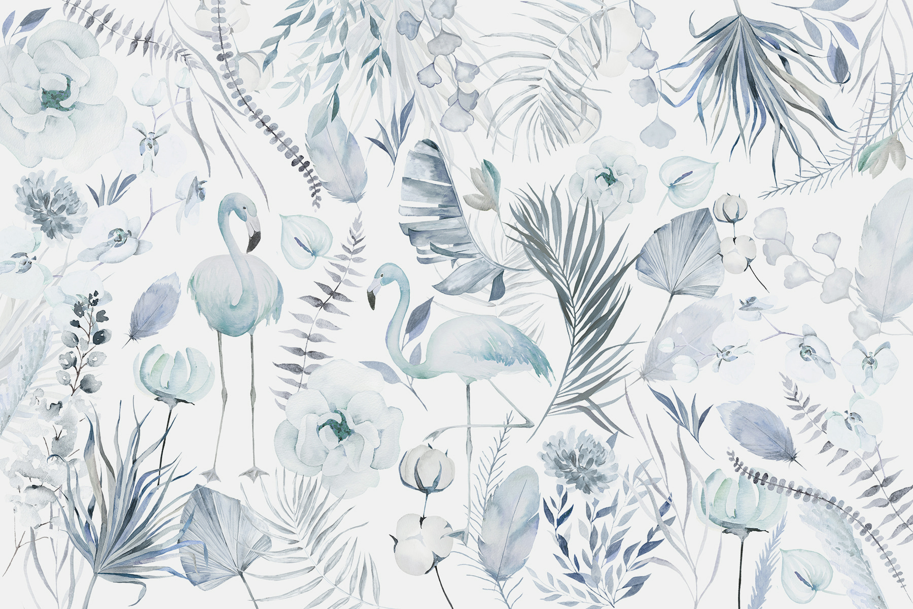 Fototapeta Plameňáci a listy v akvarelové harmonii. (SKU: w00507v1)