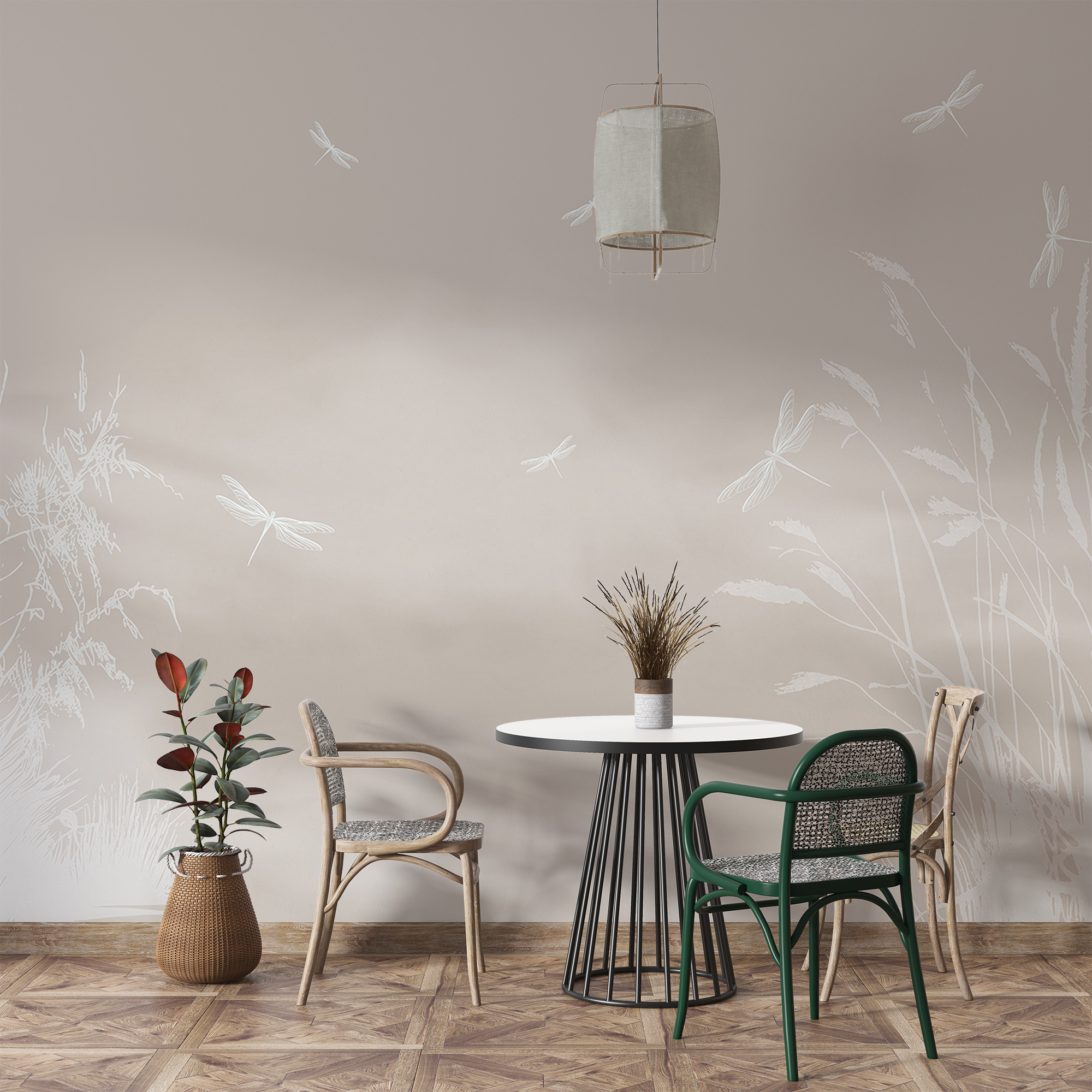Potřebujete něco snového na zeď? Podívejte se na tuto nástěnnou malbu – na jemném, zemitém pozadí poletují jemné bílé vážky. Je to jako jemné odpoledne na poli, kde vážky tančí v lehkém vánku. Představte si, že sedíte ve svém oblíbeném křesle, v ruce šálek čaje a jste naprosto zen. Má to uklidňující atmosféru, která vás prostě nutí zhluboka se nadechnout a relaxovat. Ideální pro dodání nádechu přírody a klidu do vašeho prostoru! Věřte mi, že se v něm budete chtít ztratit pokaždé, když půjdete kolem.
