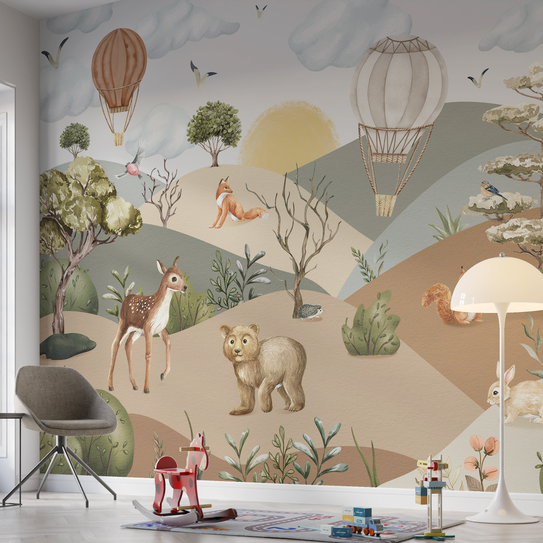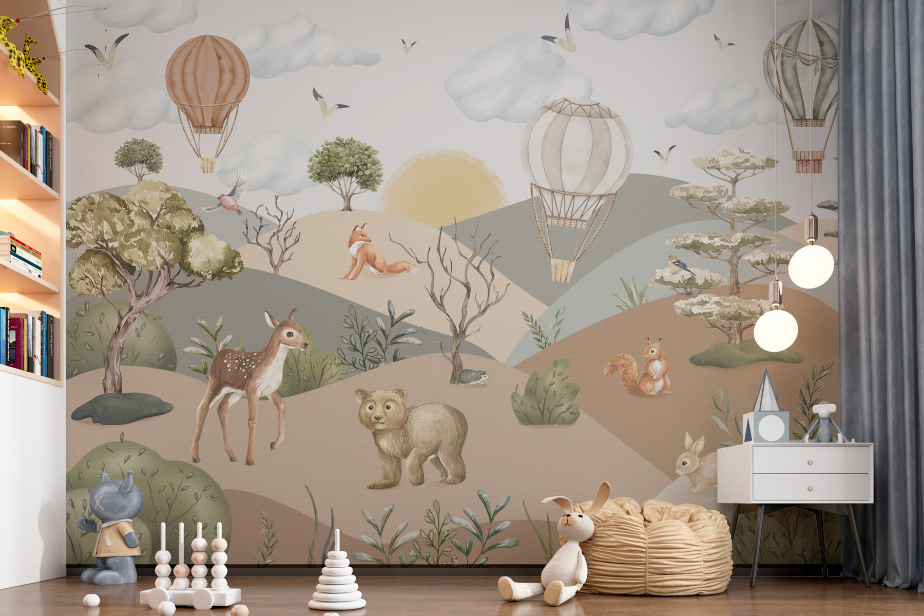 Proměňte místnost v rozmarné dobrodružství s touto podmanivou nástěnnou malbou! Je to jako vstoupit do snové krajiny, kde zvířata – myslete na zvědavé jeleny a hravé lišky – dovádějí pod oblohou posetou okouzlujícími horkovzdušnými balóny. Je ideální do dětského pokoje nebo relaxačního zákoutí a je plná veselých prvků. Představte si, že se probudíte s něžným pohledem medvěda nebo s radostně mlaskající veverkou. Tlumené tóny a hravé postavičky vytvářejí klidnou atmosféru a zároveň podněcují představivost a radost. Navíc je to fantastický začátek konverzace!