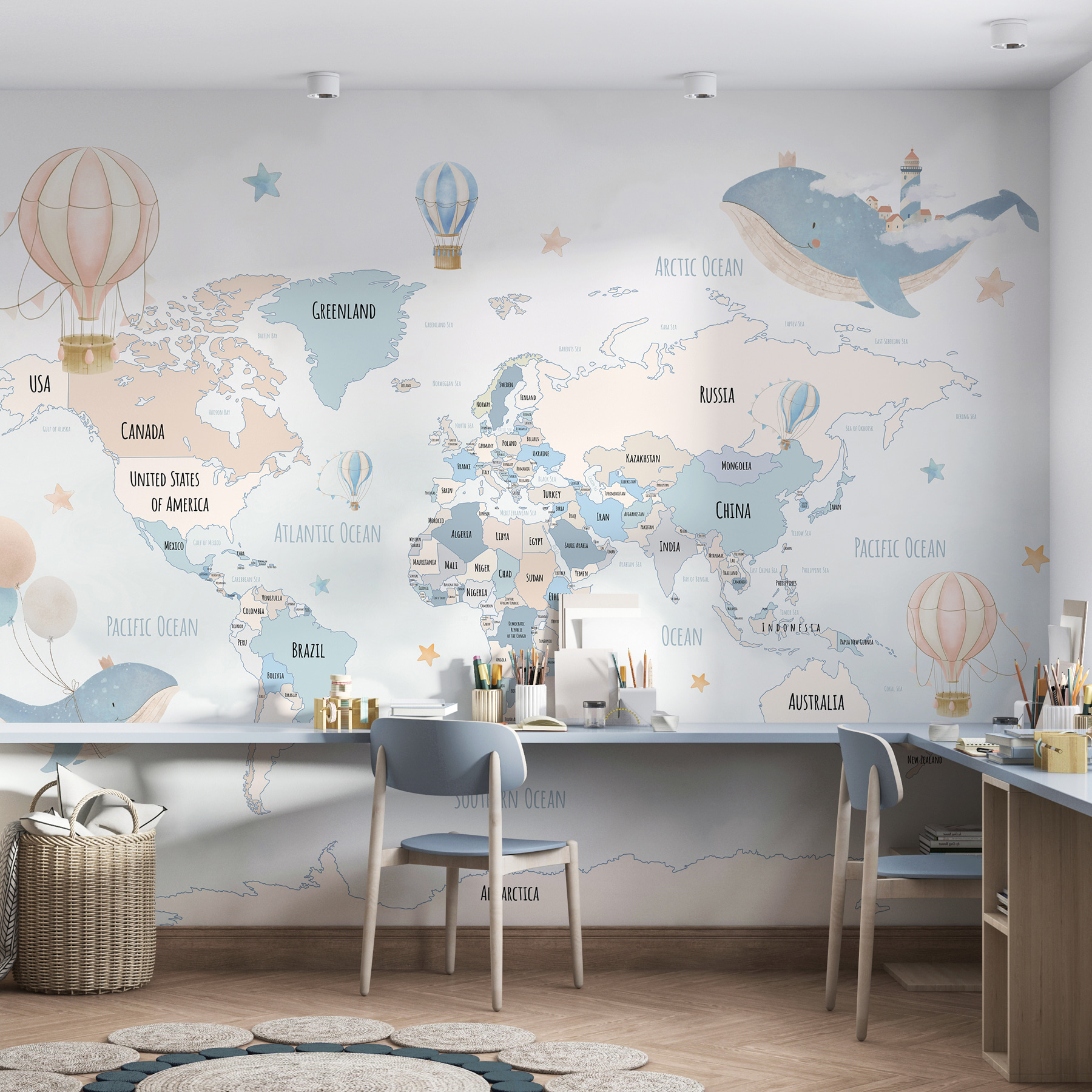 Představte si, že do dětského pokoje přidáte nádech rozmarnosti s touto úžasnou “Nástěnnou malbou modrobílý horkovzdušný balón”. Je ideální pro rozproudění malé představivosti, protože obsahuje okouzlující horkovzdušné balóny, detaily map a roztomilá zvířátka. Představte si záři měkkého odpoledního světla vrhajícího jemné stíny, díky kterému se příběhy před spaním stanou globálním dobrodružstvím. Každý detail slibuje proměnit stěnu v pas do snů – děti mohou ukázat na Brazílii nebo Austrálii a nechat svou zvědavost létat. Není to jen nástěnná malba, je to každodenní výzva k úžasu, objevování a velkým snům. A ty jemné pastely? Bez problémů splynou s jakýmkoli interiérem a dodají mu klidnou, ale hravou atmosféru. Skvěle se hodí pro vnesení kouzelného nádechu do dětských pokojů a heren.