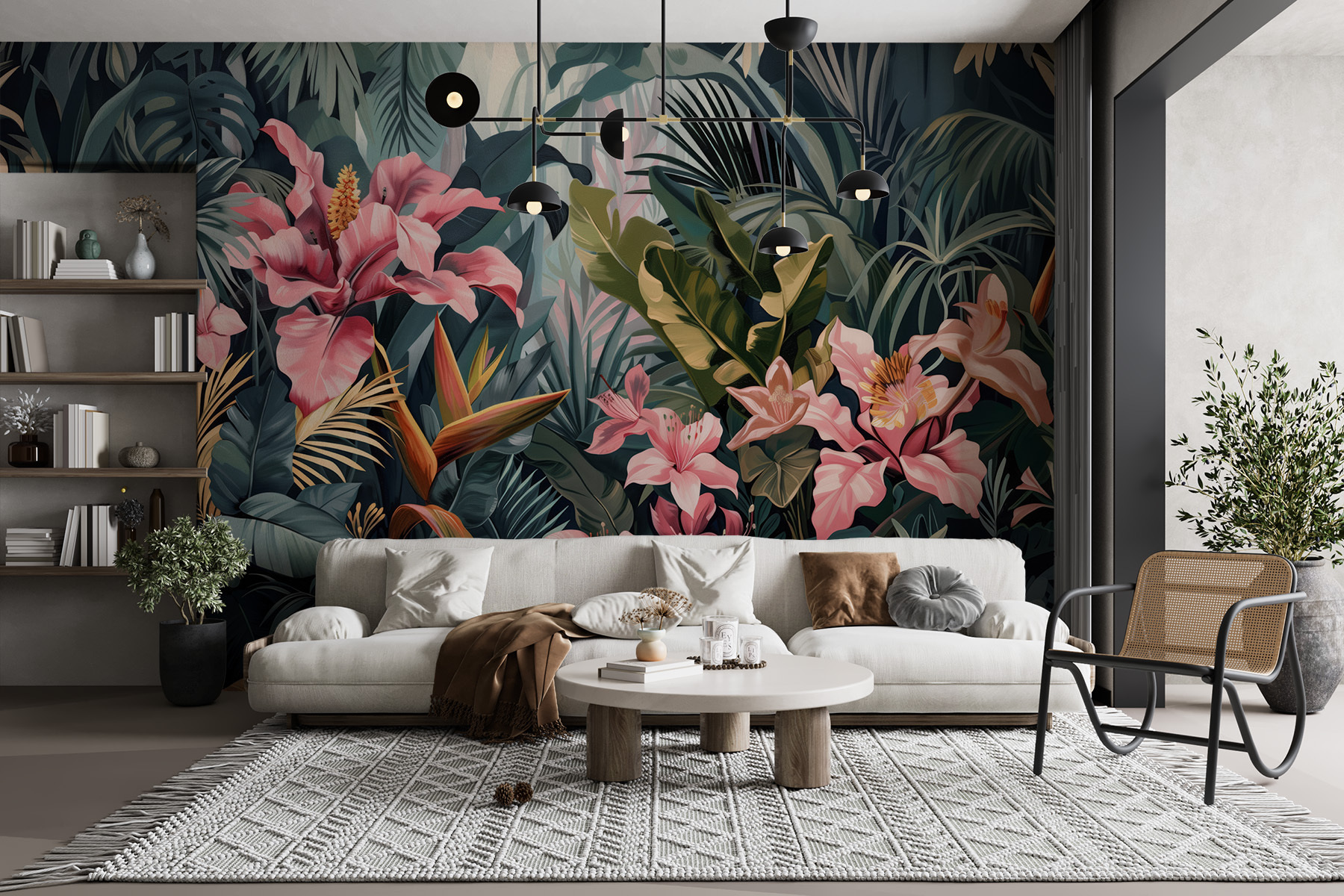 Představte si, že se po dlouhém dni vrátíte domů, sundáte si boty a přímo v obývacím pokoji vás přivítá svěží džungle. Přesně taková je tato živá nástěnná malba. Je to jako vstoupit do tropického ráje plného výrazných růžových květů a bohaté zeleně, aniž byste museli opustit svůj dům! Je ideální pro dodání velkého wow faktoru jakémukoli prostoru, ať už je to obývací pokoj, ložnice, nebo dokonce elegantní domácí kancelář.
