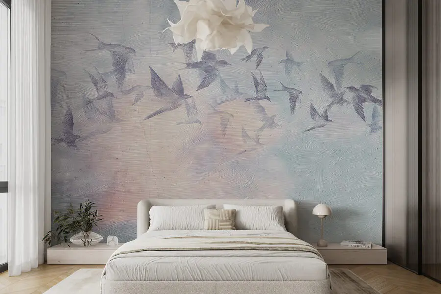 Představte si, že se probudíte a na stěně se vám budou třepotat jemní ptáčci namalovaní zasněnými akvarely. Přesně to nabízí nástěnná malba “Hejno ptáků létajících na obloze”. Není to jen umělecké dílo – je to výjev z klidného snění, zachycující jemný tok přírody.