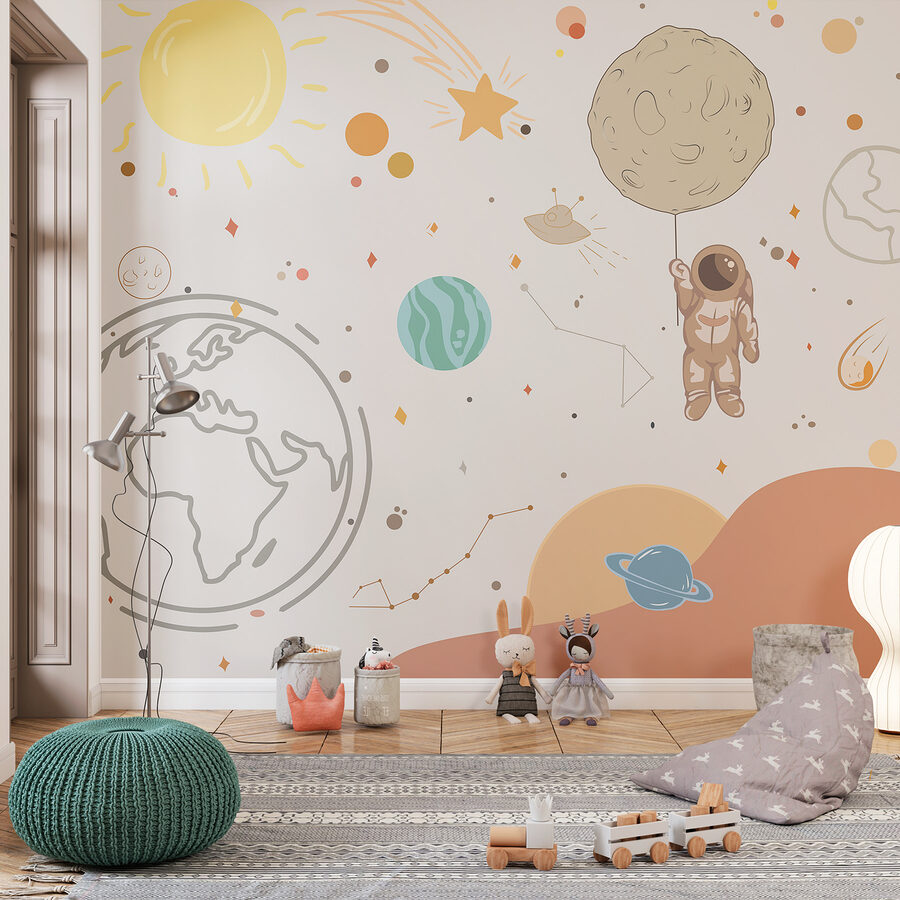 Představte si, že se díváte do snového, rozmarného vesmíru, aniž byste opustili svůj obývací pokoj. Tato “Nástěnná malba Karikatura planety” je ideální pro každého, kdo miluje galaxii a má slabost pro rozkošné umění astronautů. Design je hravý a plný planet, hvězd a dokonce i veselého malého vesmírného cestovatele, který se drží balónu připomínajícího měsíc. Ideální pro zpestření dětského pokoje nebo dodání trochy vesmírného kouzla jakémukoli prostoru. Není to jen nástěnná malba – je to celá atmosféra. Budete si připadat, jako byste se vznášeli v jemné kreslené galaxii.