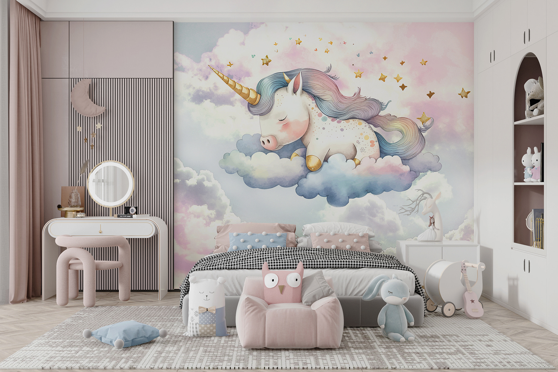 Navíc je kresba tak detailní, že si skoro dokážete představit, o čem ten jednorožec sní. Možná o sladkých obláčcích nebo duhových dobrodružstvích? Je to ten druh nástěnné dekorace, která nejen vypadá úžasně, ale také vnese do vašeho prostoru radost a trochu hravé fantazie. Pokud tedy chcete proměnit obyčejnou stěnu v něco kouzelného a hřejivého, tato nástěnná malba vás dostane.
