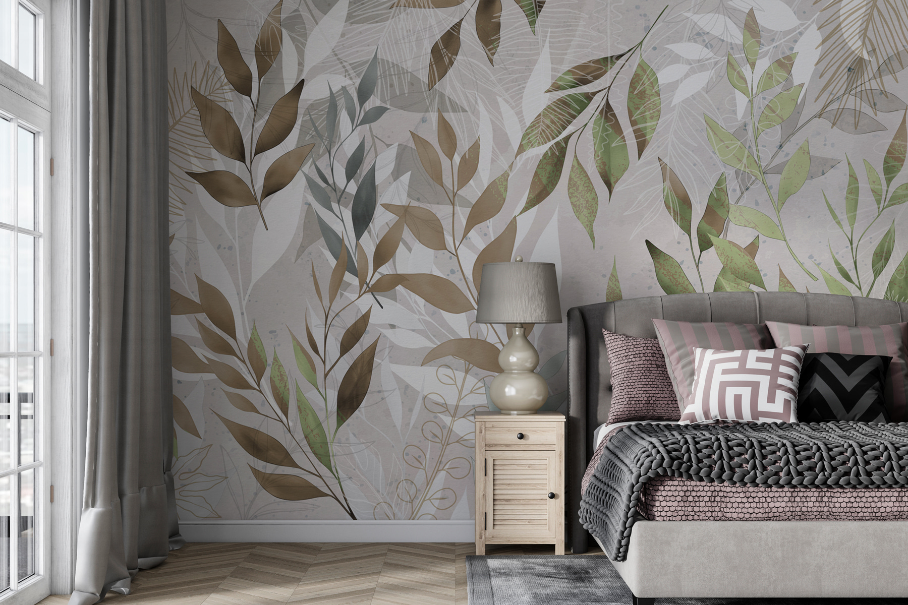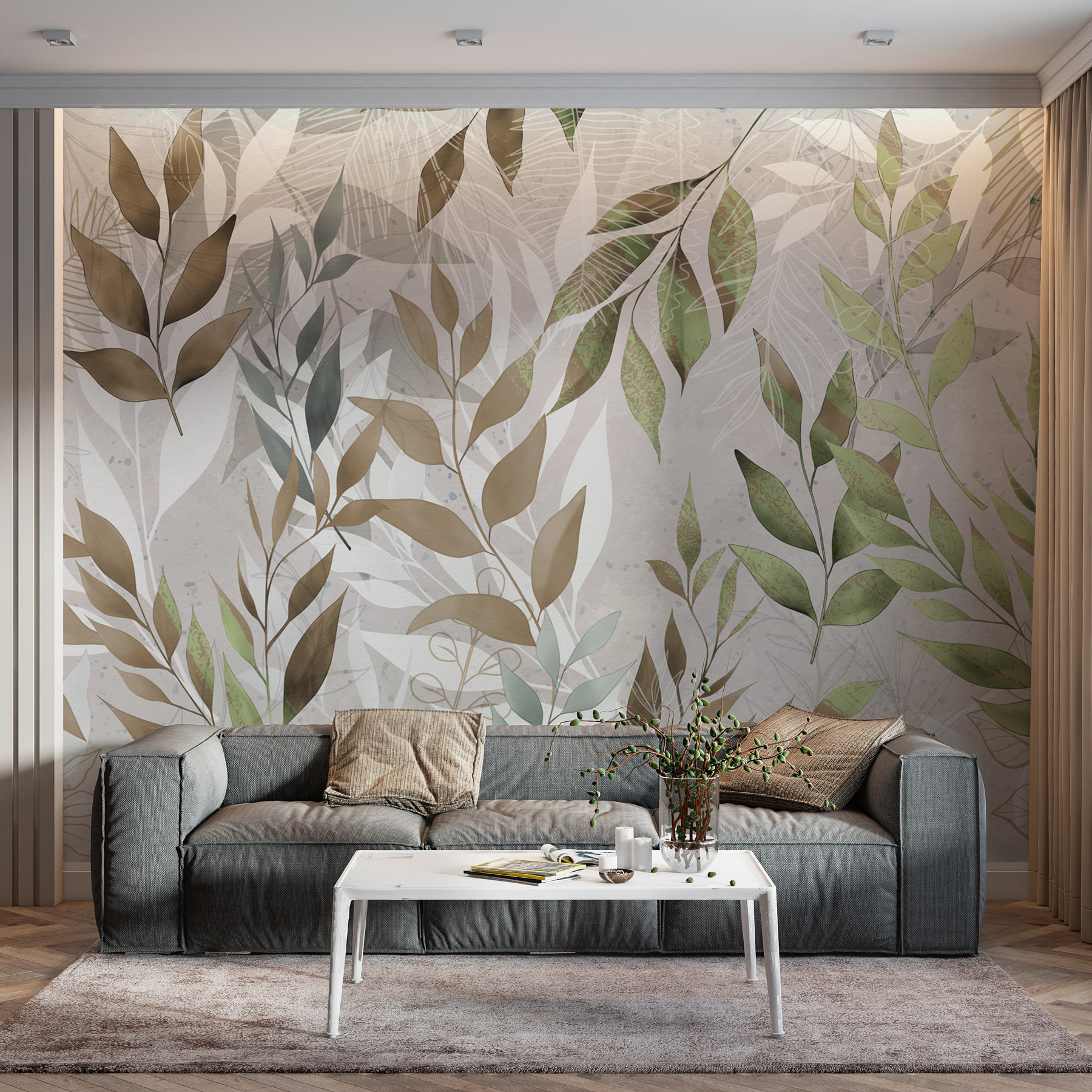 Barvy jsou jemné, ale živé zelené a hnědé, dokonale namíchané, aby dodaly ten nenuceně chladný vzhled. Pokaždé, když se na něj podíváte, můžete se cítit o něco uvolněněji, jako byste si dopřáli mini dovolenou. Skvělé pro lidi, kteří milují krásu přírody, ale nemohou být stále venku. Tato nástěnná malba nejen zdobí, ale vytváří zážitek – představte si útulná rána s kávou nebo večery s tichou hudbou, obklopeni tímto krásným listnatým uměleckým dílem. Ideální pro snění.