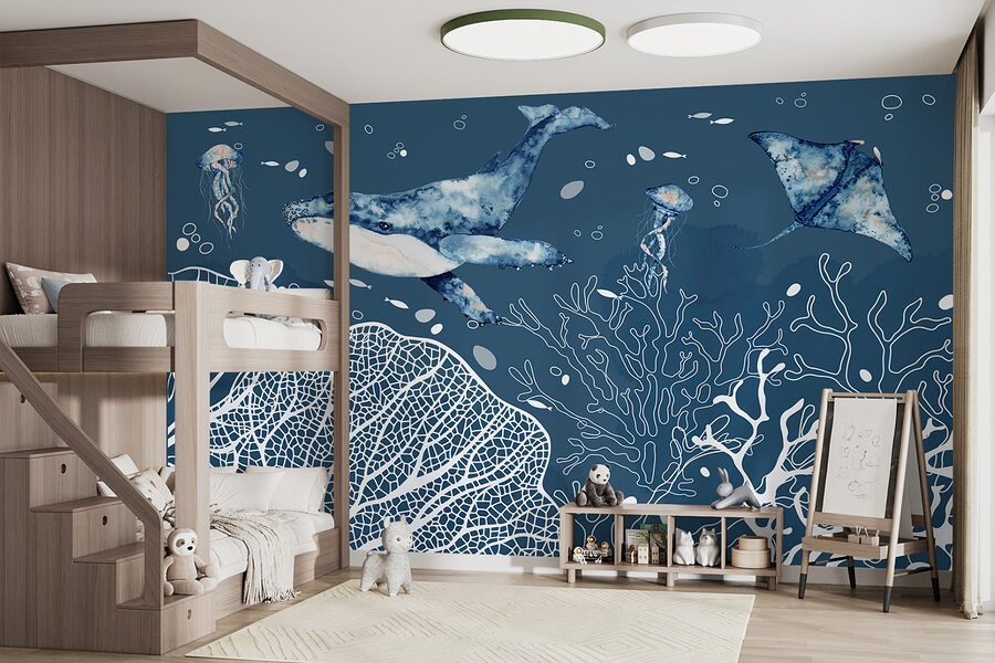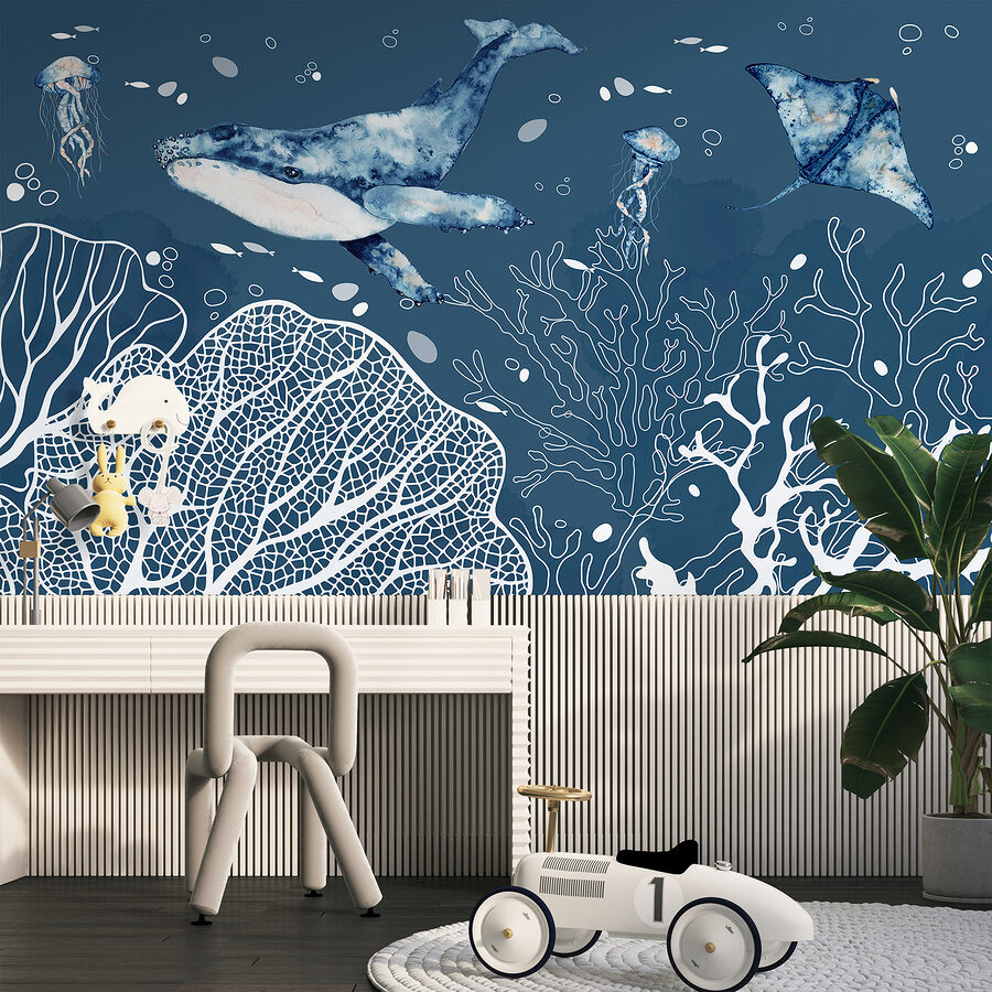 Ponořte se do klidných a fascinujících hlubin oceánu s nástěnnou malbou “Podmořské divy hlubokého moře”. Tato fototapeta s okouzlujícím výjevem velryb, ladných rejnoků a zvědavých medúz promění jakýkoli prostor v klidný mořský ráj. Představte si, jak uklidňující modré odstíny a složité vodní detaily oživí váš pokoj! Ideální pro přidání trochy eskapismu na vaši zeď – je to téměř jako šnorchlování bez namočení. Skvělá volba pro milovníky oceánu nebo pro každého, kdo si chce kousek klidu dopřát přímo u sebe doma. Věřte mi, že tato nástěnná malba je naprostým začátkem konverzace a snovým doplňkem každého pokoje!
