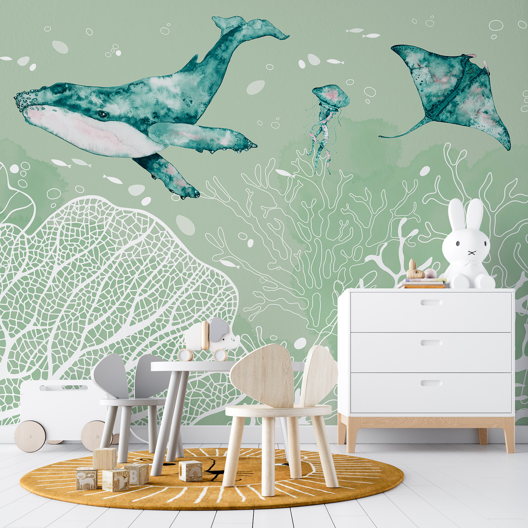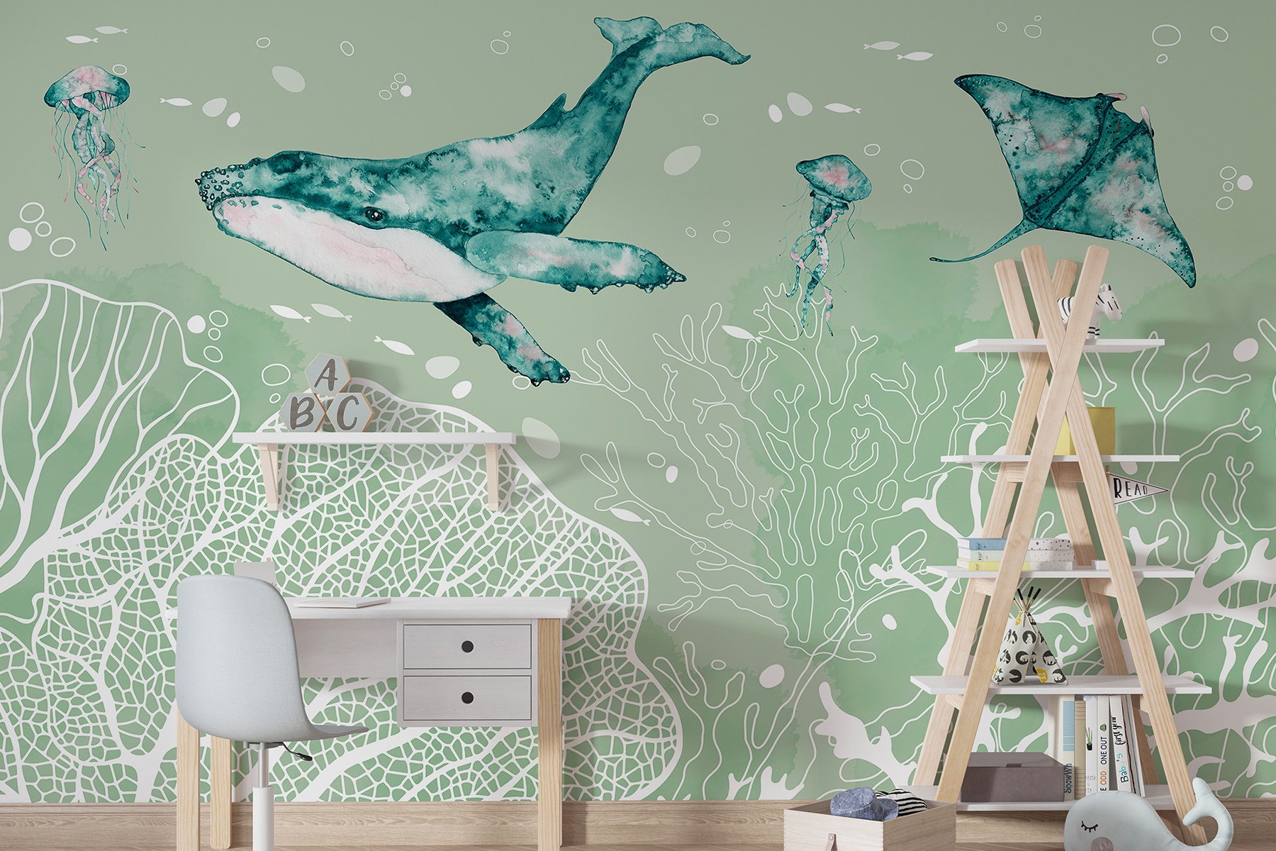 Ponořte se do kouzla oceánu s nástěnnou malbou “Podmořský svět”. Vážně, je to jako mít akvárium bez nutnosti údržby – bez krmení rybiček a výměny vody. Na tomto úžasném díle najdete vše od ladných velryb až po tajemné medúzy, které plavou v klidném, zasněném zeleném moři, díky němuž se váš prostor bude určitě cítit jako klidný podmořský přístav.