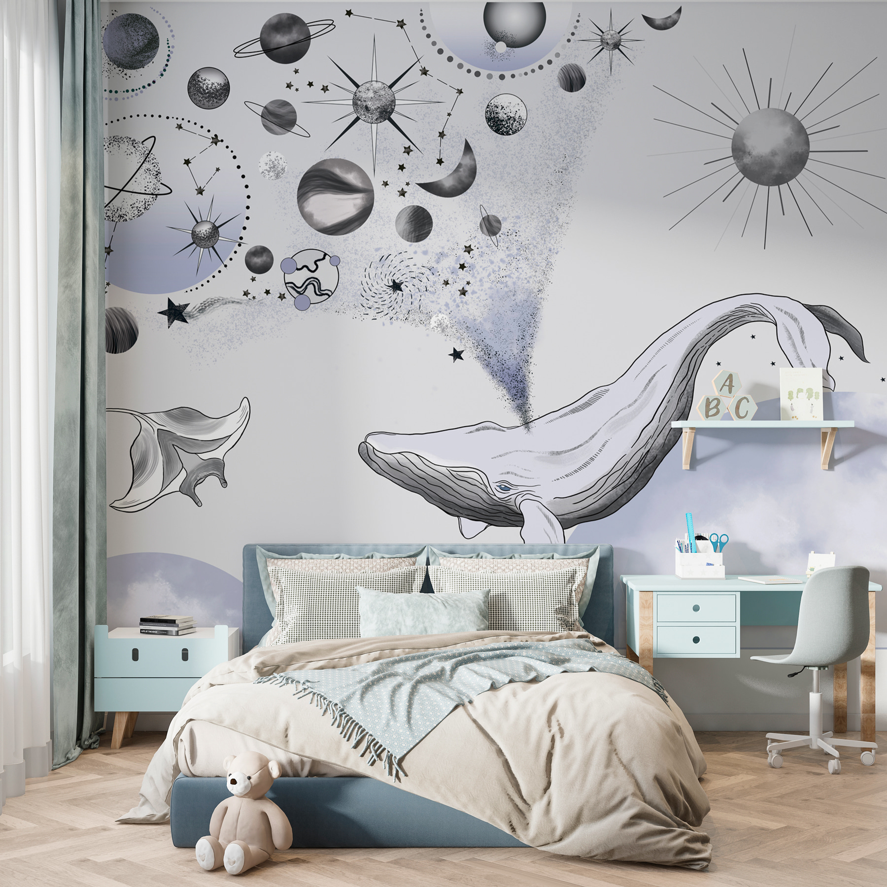 Proměňte jakýkoli prostor pomocí této nástěnné malby, která působí jako procházka snovou říší divů. Představte si něžnou velrybu klouzající vesmírem, obklopenou víry hvězdné magie a hravých planet. Černobílá atmosféra jí dodává moderní nádech, který se hodí kamkoli od dětského pokoje po útulný čtecí koutek. Je jako stvořený pro konverzaci a evokuje snění o hlubinách oceánu a hvězdné obloze. Představte si, že se schoulíte s dobrou knihou, podíváte se na tuto nástěnnou malbu a pocítíte tu jiskru představivosti. Ideální pro ty, kteří mají rádi nádech rozmarnosti ve svém interiéru!