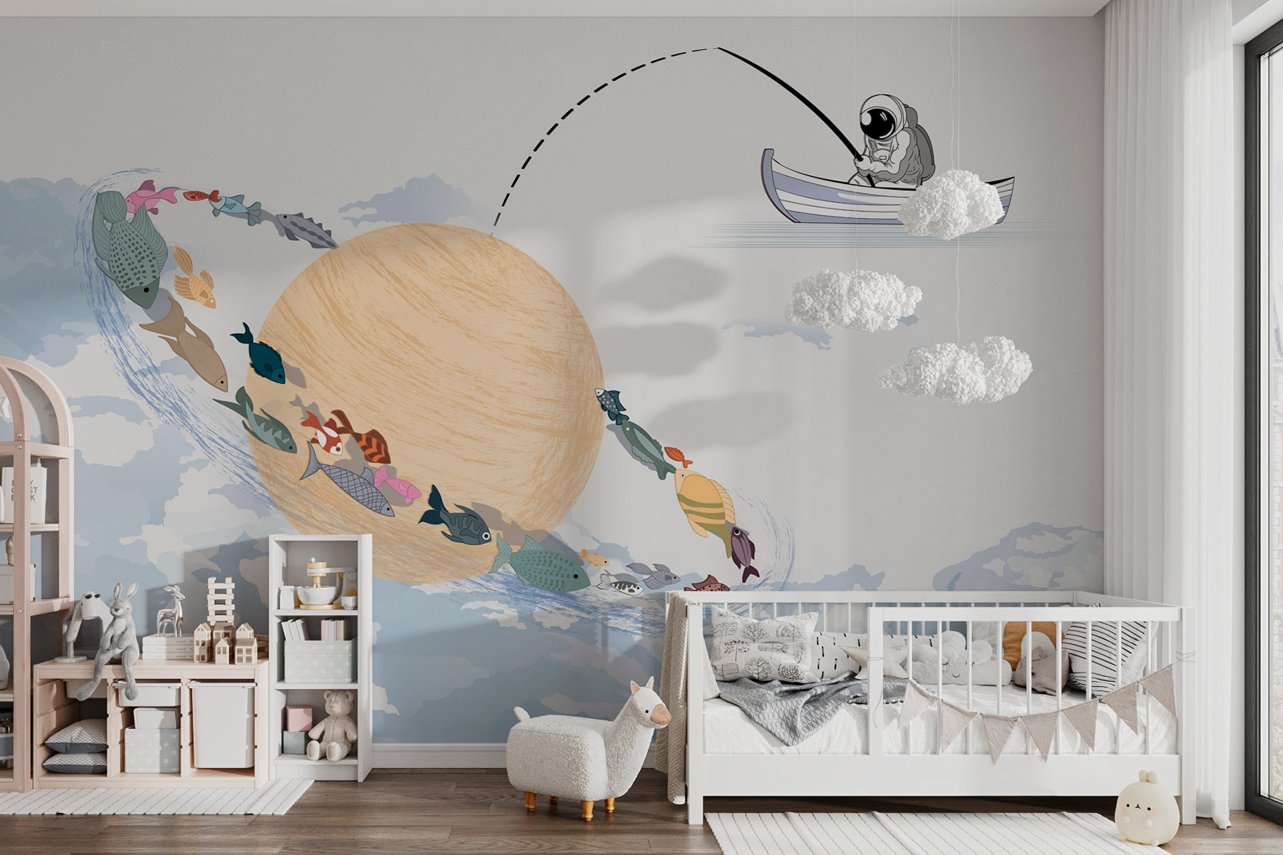 Ponořte se do světa, kde se obloha setkává s mořem, s touto rozmarnou nástěnnou malbou. Představte si obří planetu plující mezi načechranými mraky, zatímco kolem ní plavou hravé rybky jako na vesmírném dobrodružství. Vrcholem musí být lovení ryb astronauty – kdo by řekl, že se jim podaří takový úlovek? Tato nástěnná malba vnese do každé místnosti špetku fantazie a vytvoří v ní pocit útulného úniku z každodenní rutiny. Ať už v dětském pokoji, nebo ve svérázném obytném prostoru, určitě vyvolá radost a rozhovory. Jen si představte, kolik úsměvů vykouzlí!