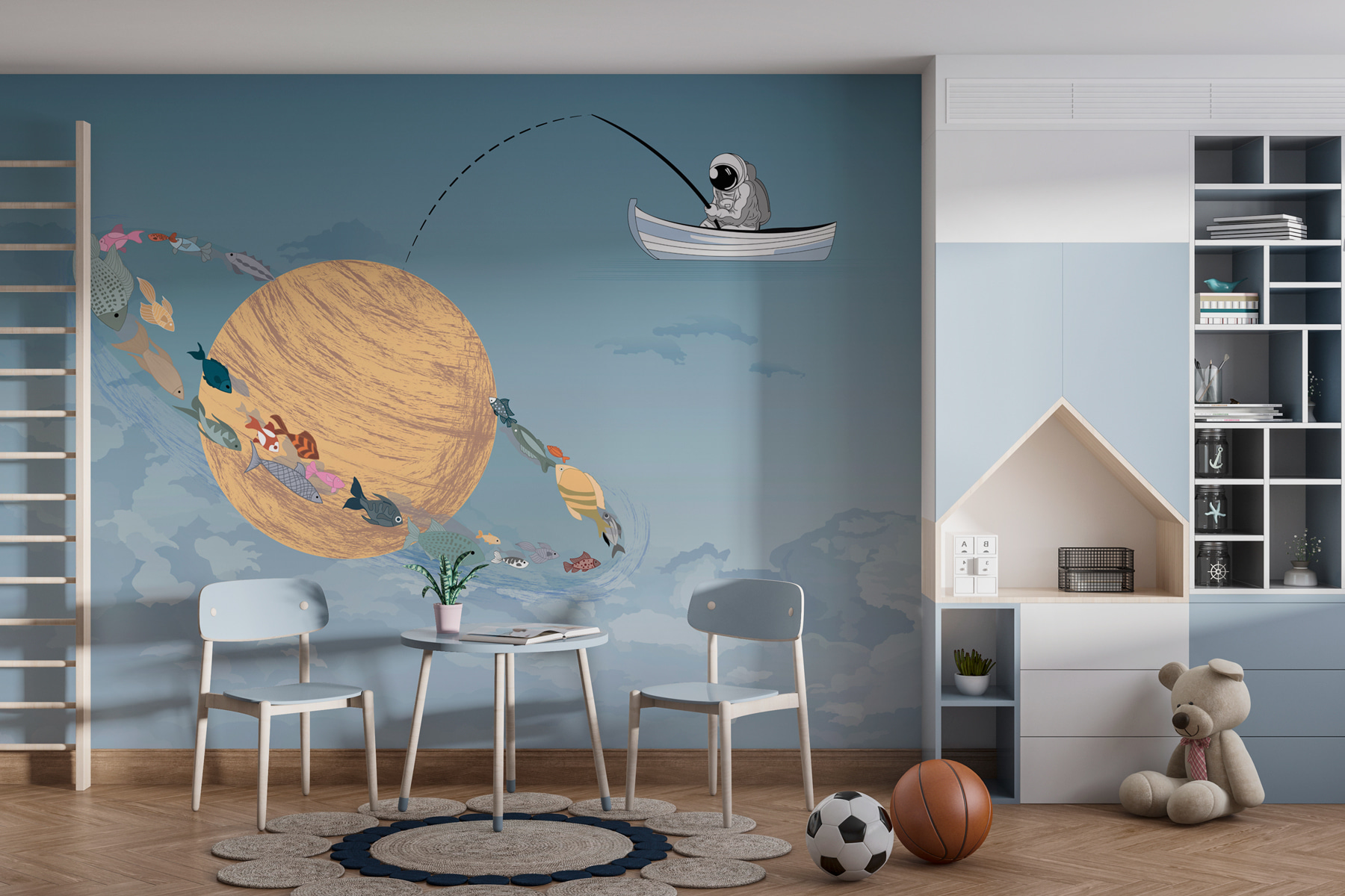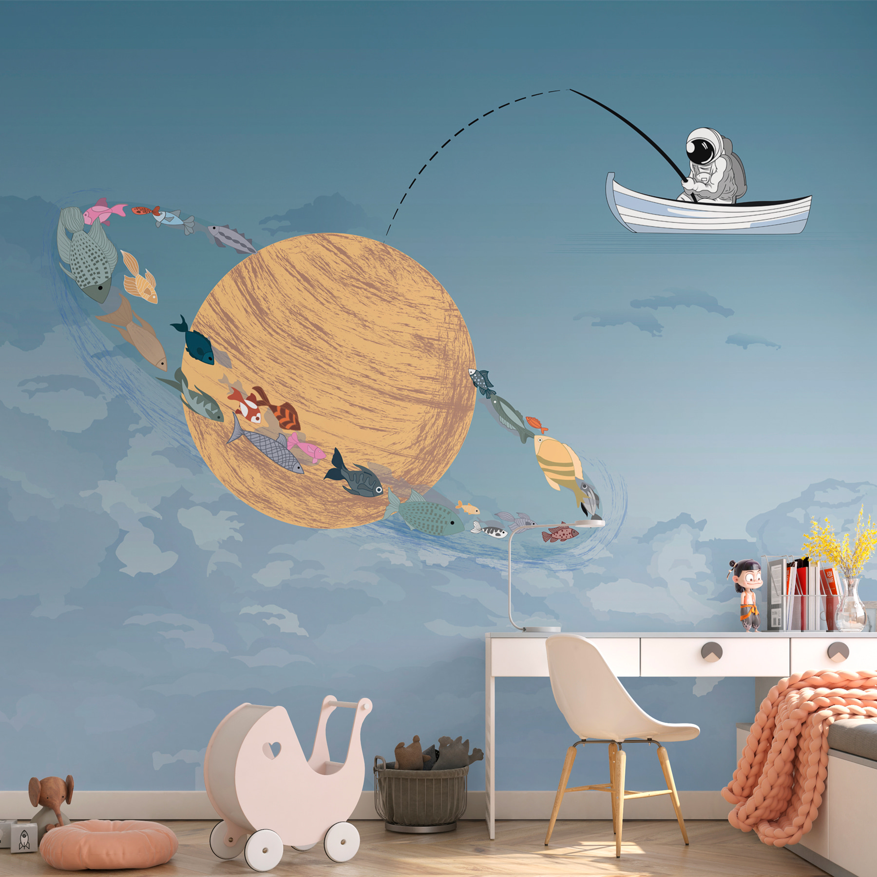 Představte si příjemný malý rybářský výlet, ale místo klidného jezera se vznášíte v oblacích. Tato nástěnná malba tento sen oživuje. Představte si rozmarnou scénu muže v loďce, který rybaří v oblacích, a barevné ryby plující kolem obří vířící planety. Jasně modrá a jemná bílá vytvářejí klidnou atmosféru, ideální pro snění. Je to jako tajné dobrodružství, které čeká přímo nad vaší hlavou. Ideální do dětského pokoje nebo kreativního prostoru, podněcuje fantazii a dodá každé stěně zábavný nádech. Kdo by nechtěl hodit čáru do oblak?