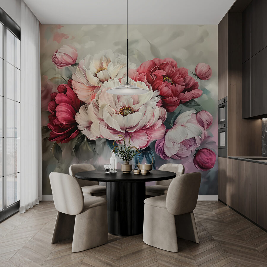 Proměňte prázdnou stěnu v kvetoucí ráj díky této živé fototapetě s úžasnými květinami. Představte si, že vstoupíte do prostoru, který je jako živý a kde každý okvětní lístek jako by tančil a vyzýval k radosti. Ať už se jedná o útulný kout nebo živý obývací pokoj, tato fototapeta mu dodá dokonalý nádech osobitosti. Představte si deštivé odpoledne, šálek teplé kávy a jen tak se kochejte krásou těchto pivoňkových květů. Je to jako mít zahradu v interiéru – a to vše bez zalévání. Jedinečná kulisa, díky které se možná každý den budete cítit jako na jaře!