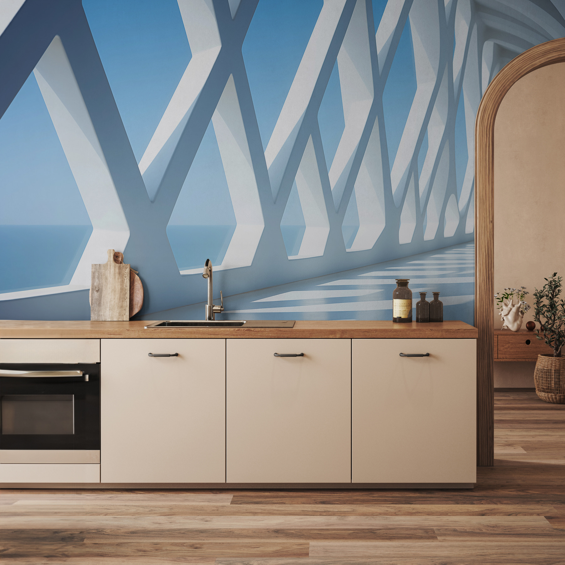 Představte si to: nástěnná malba, která promění vaši zeď ve výjev jako z futuristické umělecké galerie. “Bílá zeď s mnoha okny” je jako okno do geometrického ráje. Čisté, ostré linie a 3D design dodají vašemu prostoru pocit otevřenosti, jako nekonečný horizont, který vybízí ke snění. Je moderní, a přesto jaksi nadčasový. Představte si, že popíjíte čaj, díváte se na tuto nástěnnou malbu a cítíte se jako v objetí kreativity a klidu. Svérázný doplněk pro každou místnost, která touží po troše kouzla.