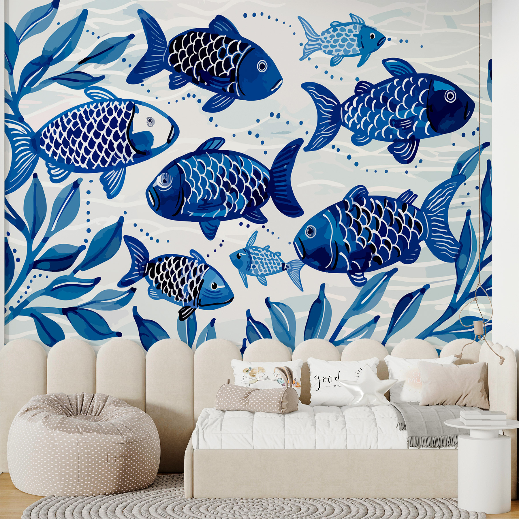 Představte si, že se vaše stěna promění v podmořskou říši divů s hravým hejnem modrých rybek, které si bez námahy kloužou. Tato nástěnná malba je jako šplouchnutí kouzelného oceánu – ideální pro ty, kteří sní o útěku k moři. Díky akvarelovým vibracím si budete připadat, jako byste leželi s prsty na nohou v písku a jemný mořský vánek vám šeptal tajemství. Není to jen dekor, je to malý únik pokaždé, když se podíváte jeho směrem. Je ideální do útulného obývacího pokoje nebo do bezstarostné ložnice s plážovou tématikou, je to jako mít své osobní akvárium bez nutnosti krmení!