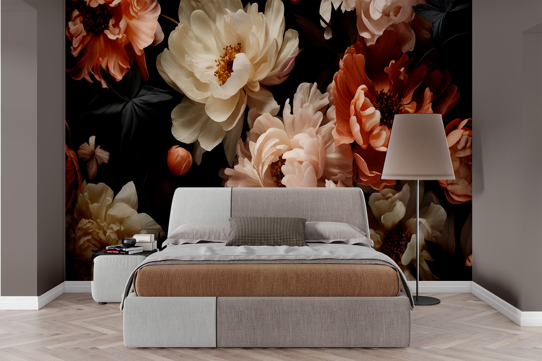 Představte si, že vejdete do místnosti a přivítá vás elegantní tanec květů na bohatém tmavém pozadí. Tato nástěnná malba vnáší do interiéru kouzlo půlnoční zahrady, kde se pivoňky a další květiny jemně pohupují, jako by je zachytil jemný vánek. Je to šepot dramatické přírody, ideální pro vytvoření útulného zákoutí nebo proměnu fádní stěny ve výrazný kousek. Hluboké kontrasty navozují pocit pohody a intrik, jako když za soumraku objevíte tajnou zahradu, která vyvolává pocit dobrodružství a klidu zároveň.