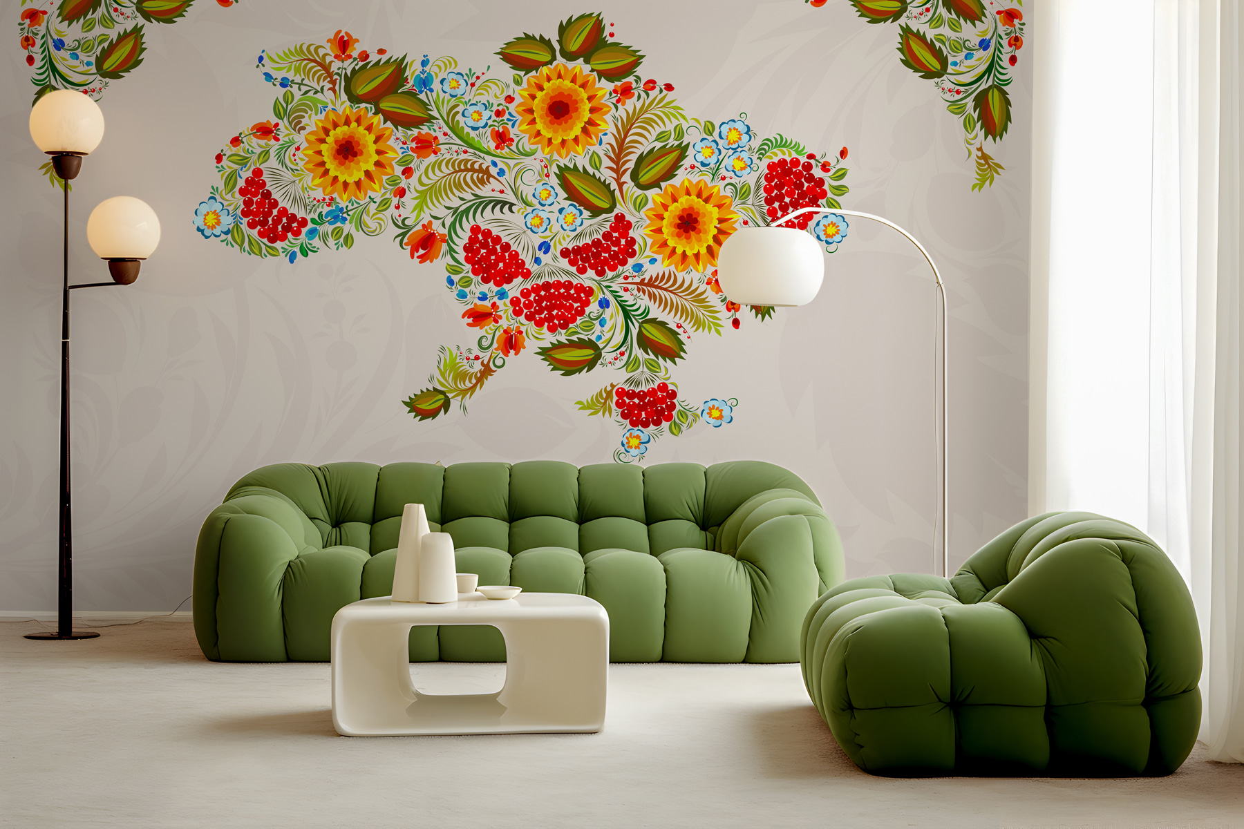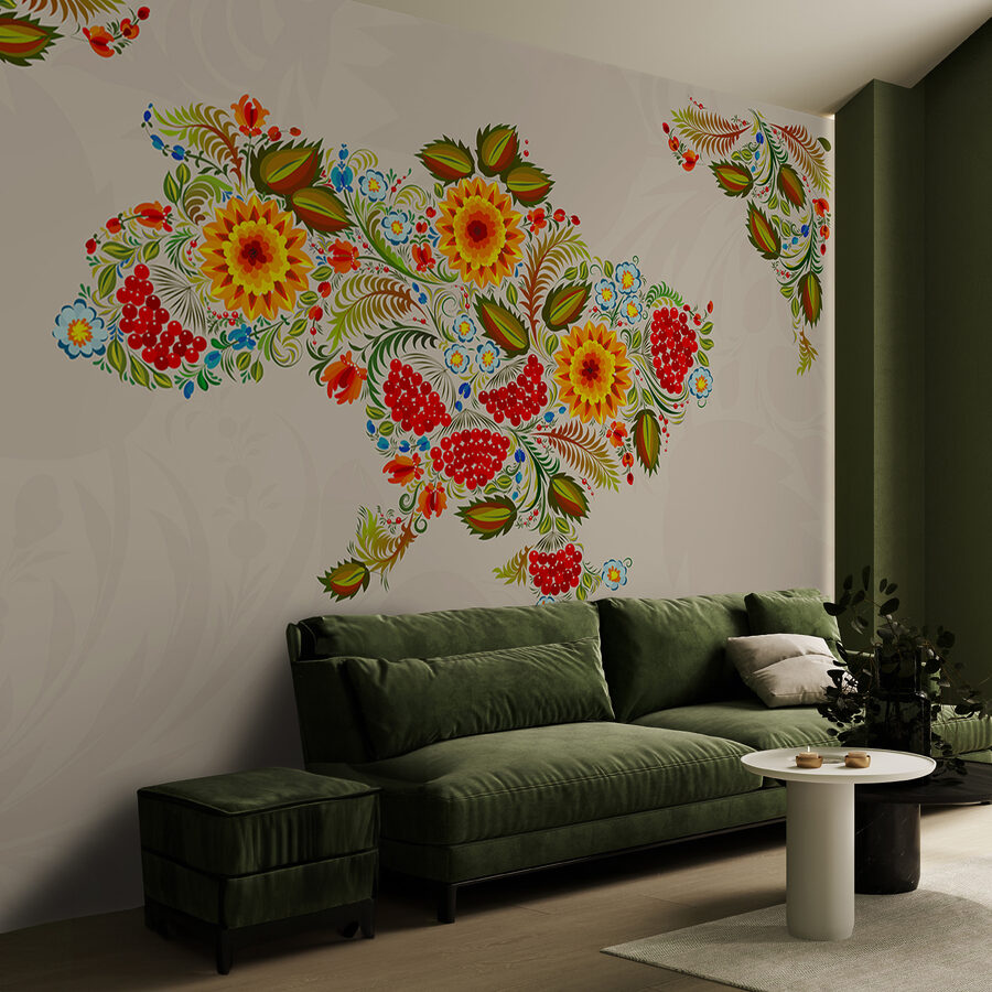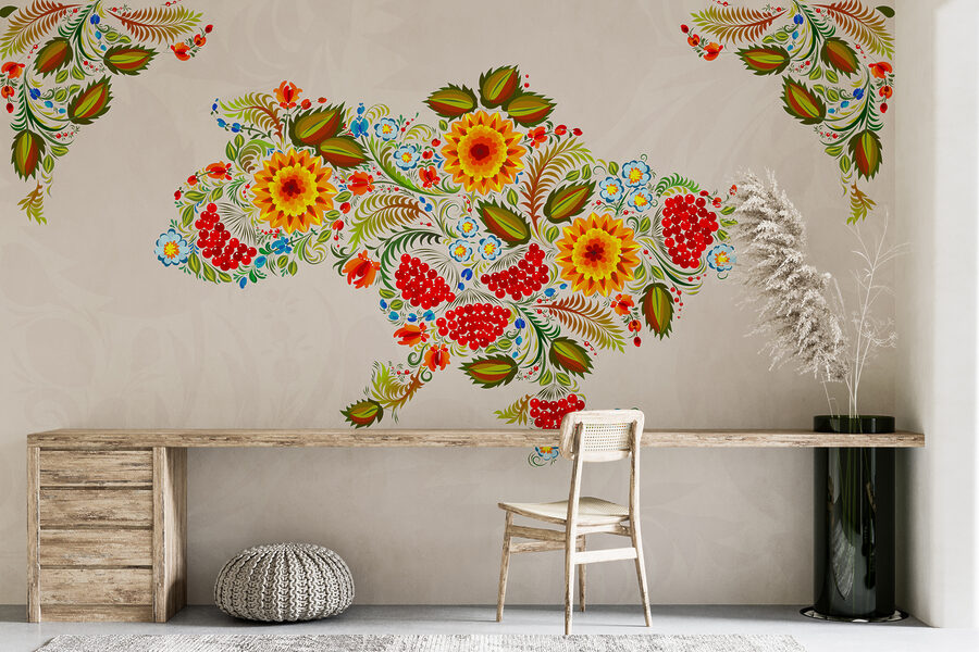 Ahoj, milovníku dekorací! Seznamte se s touto úžasnou nástěnnou malbou – je to mapa Ukrajiny, ale vyměňte nudné čáry za výrazné rozkvetlé květiny. Představte si, že váš pokoj naplní příval barev, jako by do něj právě vtrhla zahrada. Ty sytě žluté a červené barvy, které se mísí se zářivou zelení – čirá radost! Je to jako mít umělecké dílo, které šeptá příběhy tradic a kultury. Kdo by nechtěl začínat každý den s pocitem, že vstupuje na slavnost? Ideální pro každého, kdo touží po trochu více krásy a charakteru ve svém prostoru.